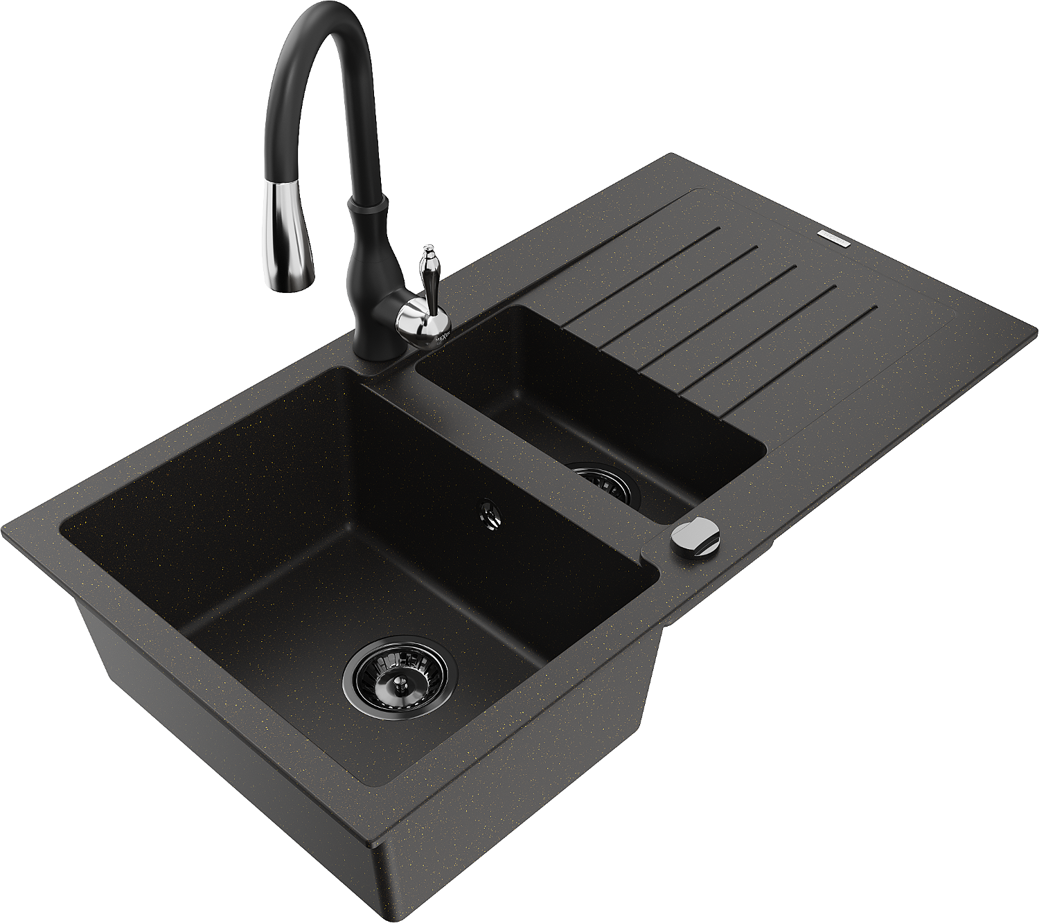 Mexen Matias évier en granit 1,5 bac avec égouttoir et robinet de cuisine Savita, noir/or - 6502-75-672601-70-B