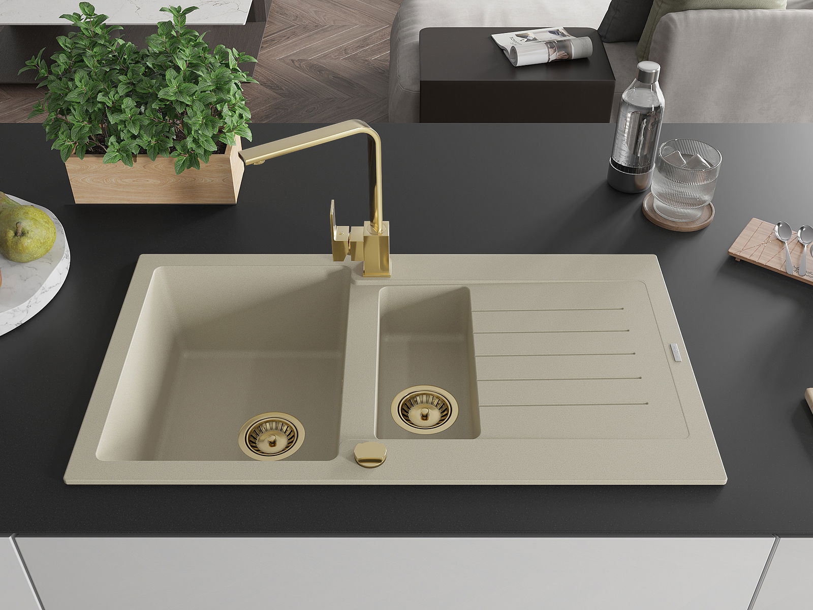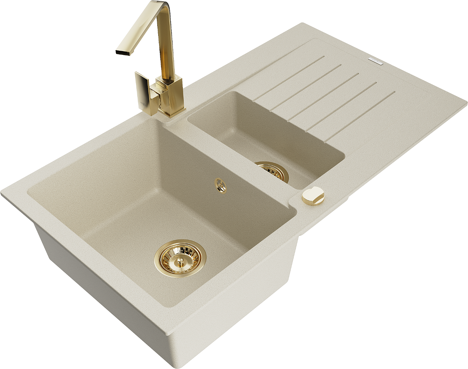 Mexen Matias évier en granit 1,5 bacs avec égouttoir et robinet de cuisine Rita, beige - 6502-69-670300-50