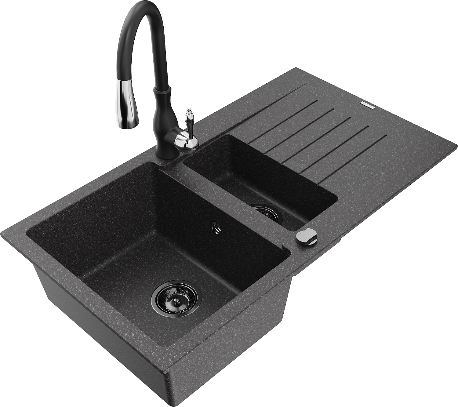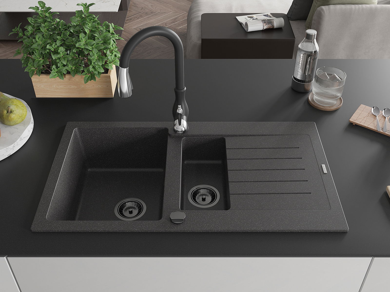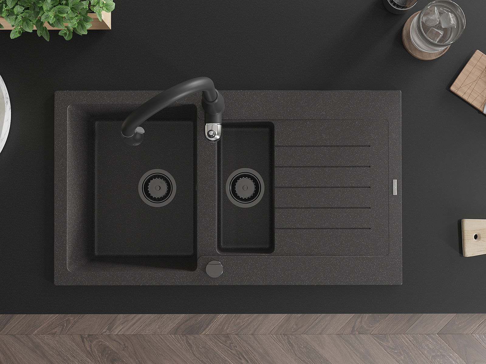 Mexen Matias évier en granit 1,5 bac avec égouttoir et robinet de cuisine Savita, noir moucheté - 6502-76-672601-70-B