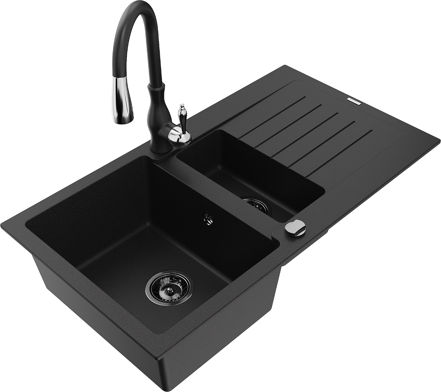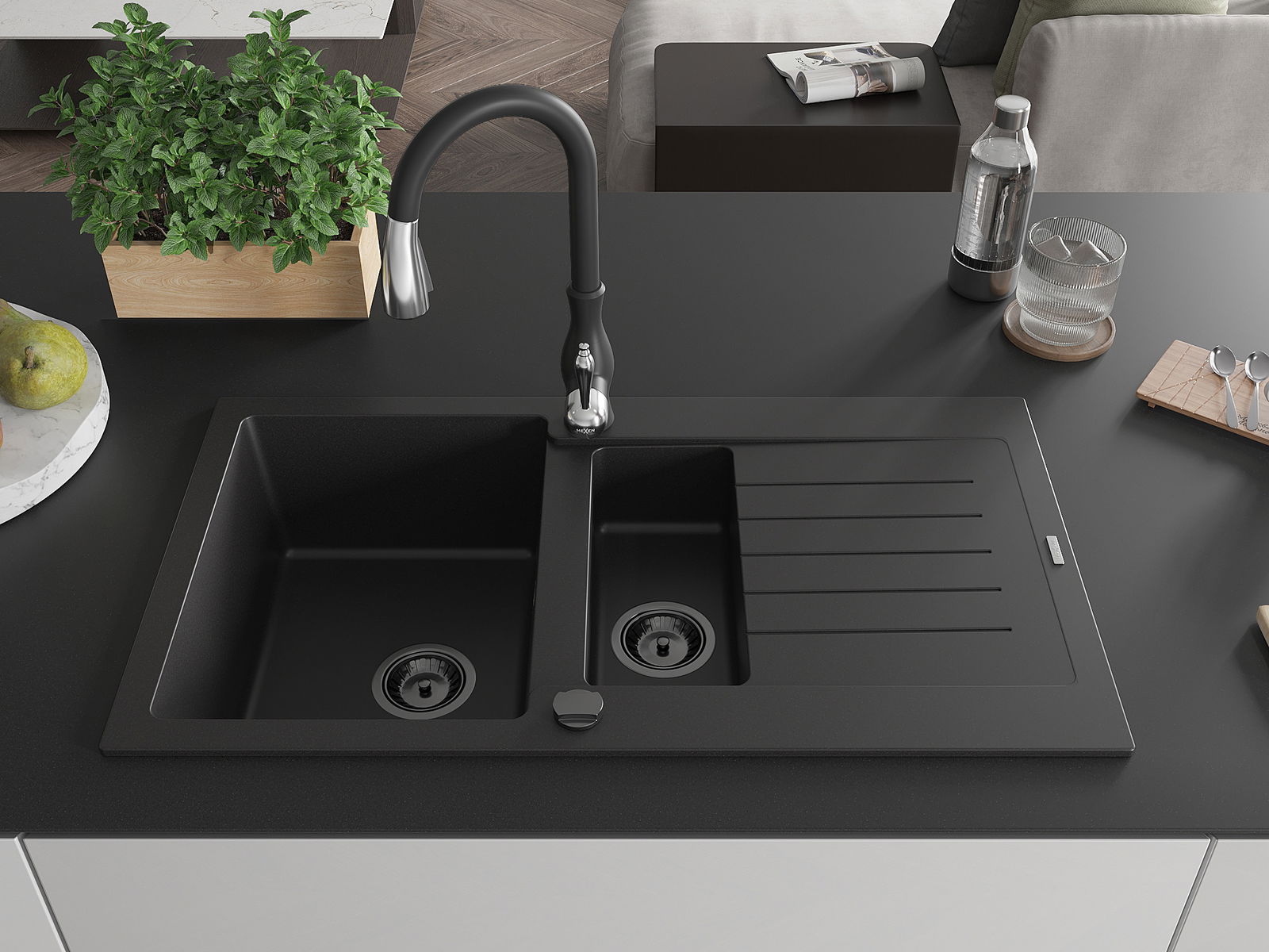 Mexen Matias évier en granit 1,5 bac avec égouttoir et robinet de cuisine Savita, noir - 6502-77-672601-70-B