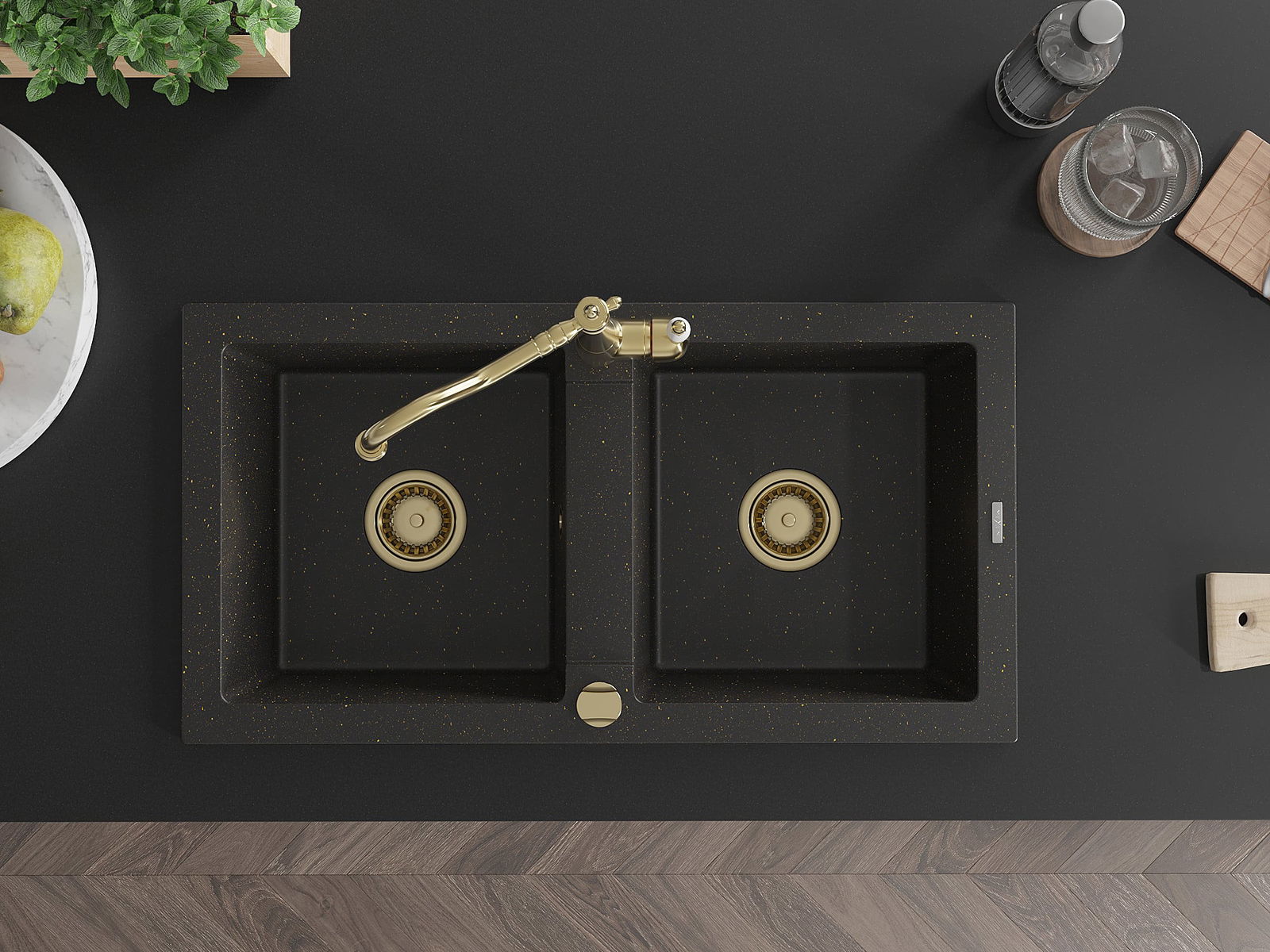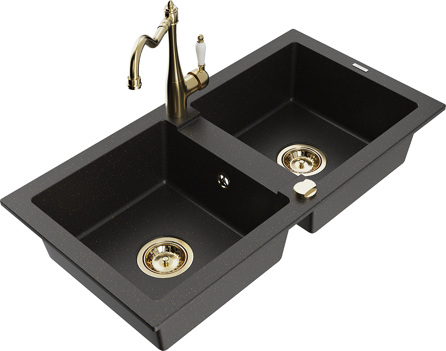 Mexen Mario évier en granit à 2 bacs avec robinet de cuisine Carla, noir/doré métallisé - 6504-75-670700-50