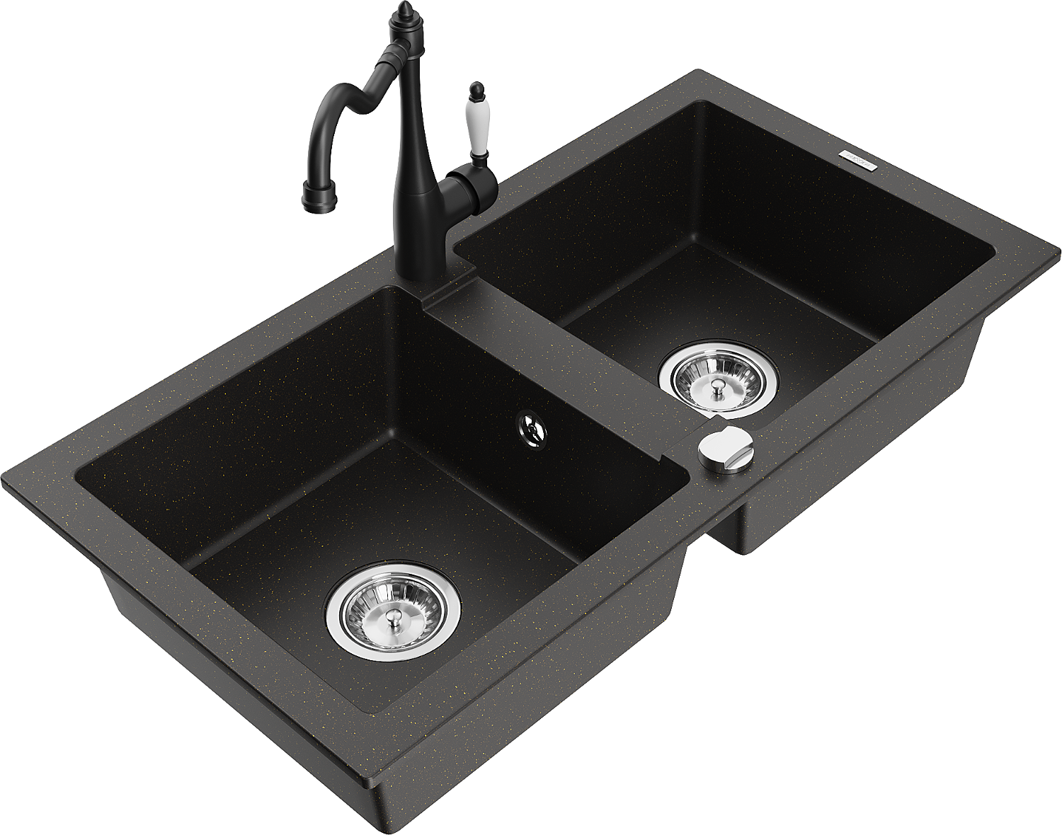 Mexen Mario évier en granit à 2 cuves avec robinet de cuisine Carla, noir/doré métallique - 6504-75-670700-70