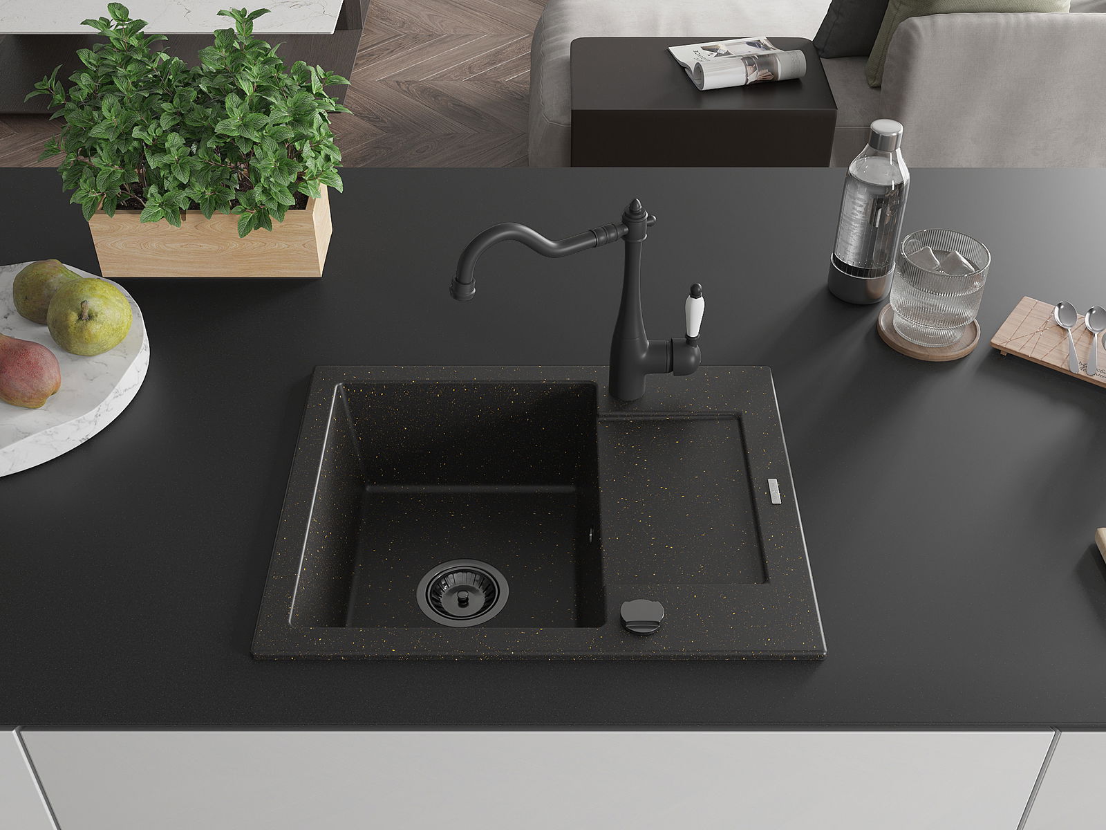 Mexen Enzo évier en granit à 1 bac avec égouttoir et mitigeur de cuisine Carla, noir/or métallique - 6506-75-670700-70-B