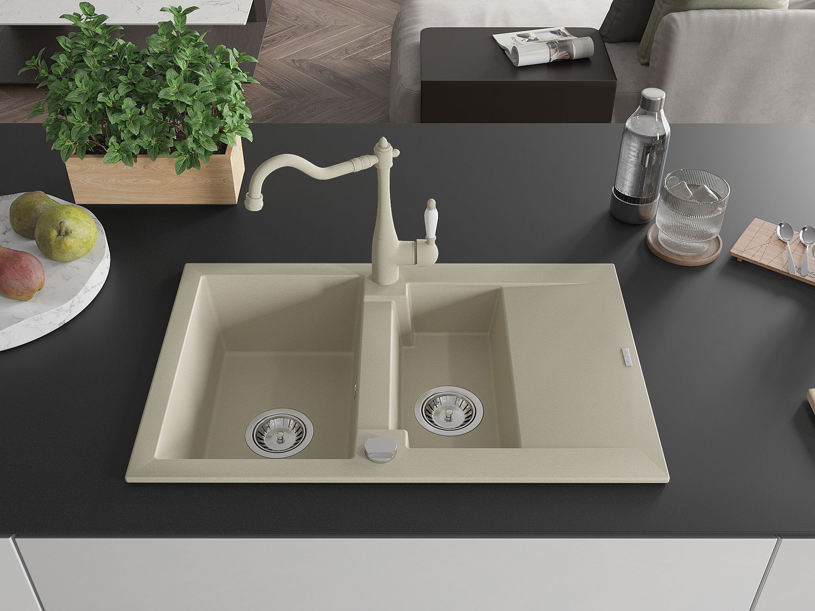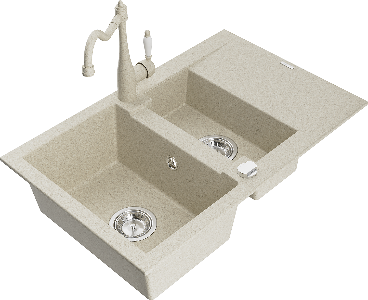 Mexen Gaspar évier en granit 1,5 bac avec égouttoir et robinet de cuisine Carla, beige - 6507-69-670700-69
