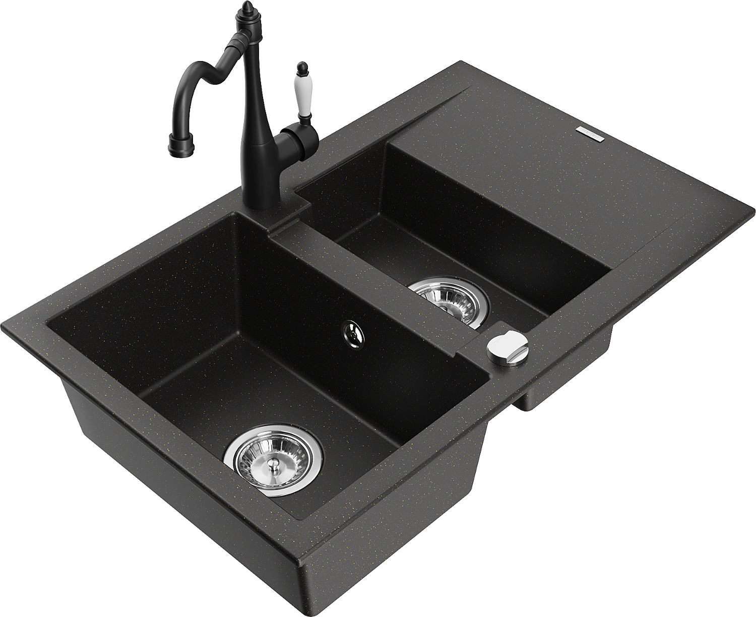 Mexen Gaspar évier en granit 1,5 bac avec égouttoir et robinet de cuisine Carla, noir/or métallique - 6507-75-670700-70