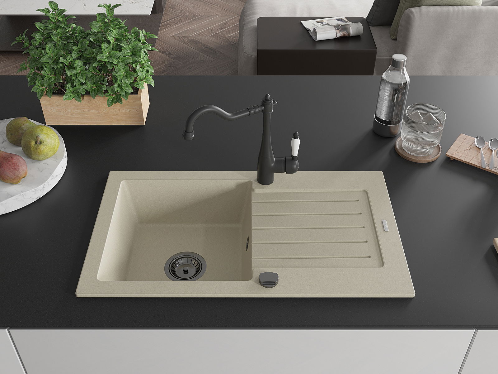 Mexen Pablo évier en granit 1-bac avec égouttoir et robinet de cuisine Carla, beige - 6510-69-670700-70