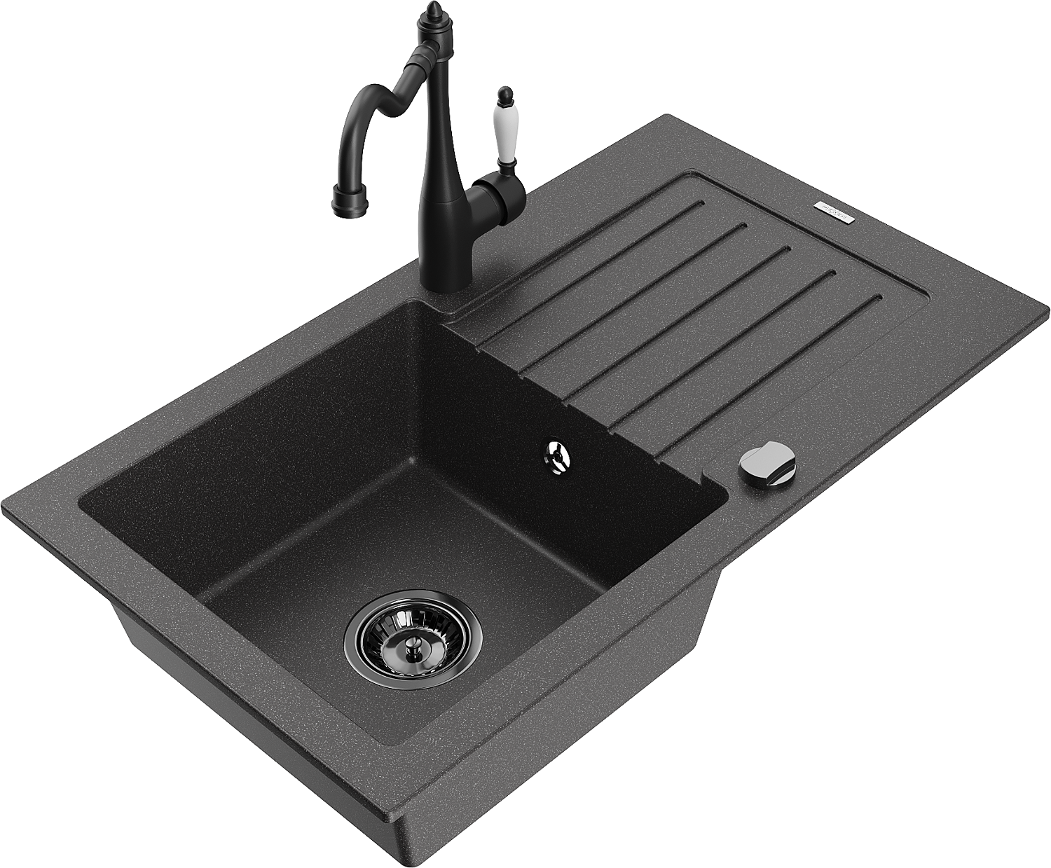 Mexen Pablo évier en granit 1 bac avec égouttoir et mitigeur de cuisine Carla, noir moucheté - 6510-76-670700-70-B