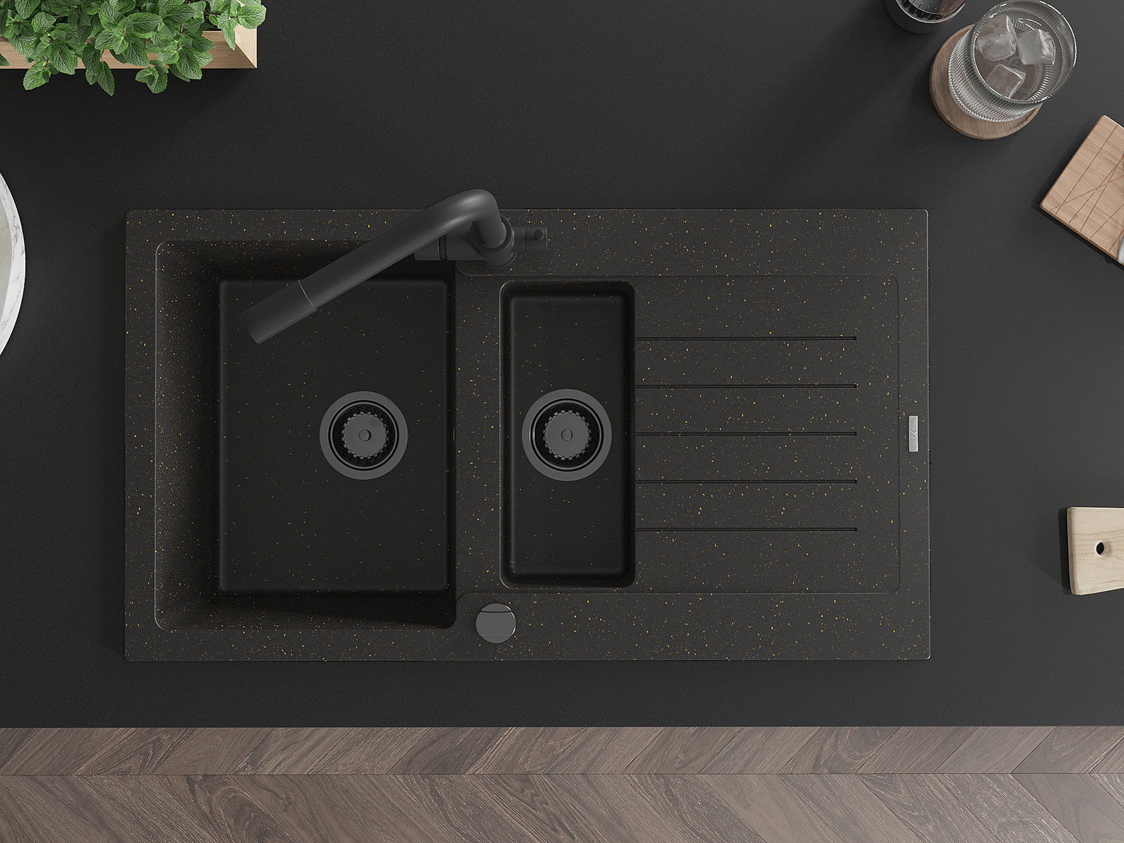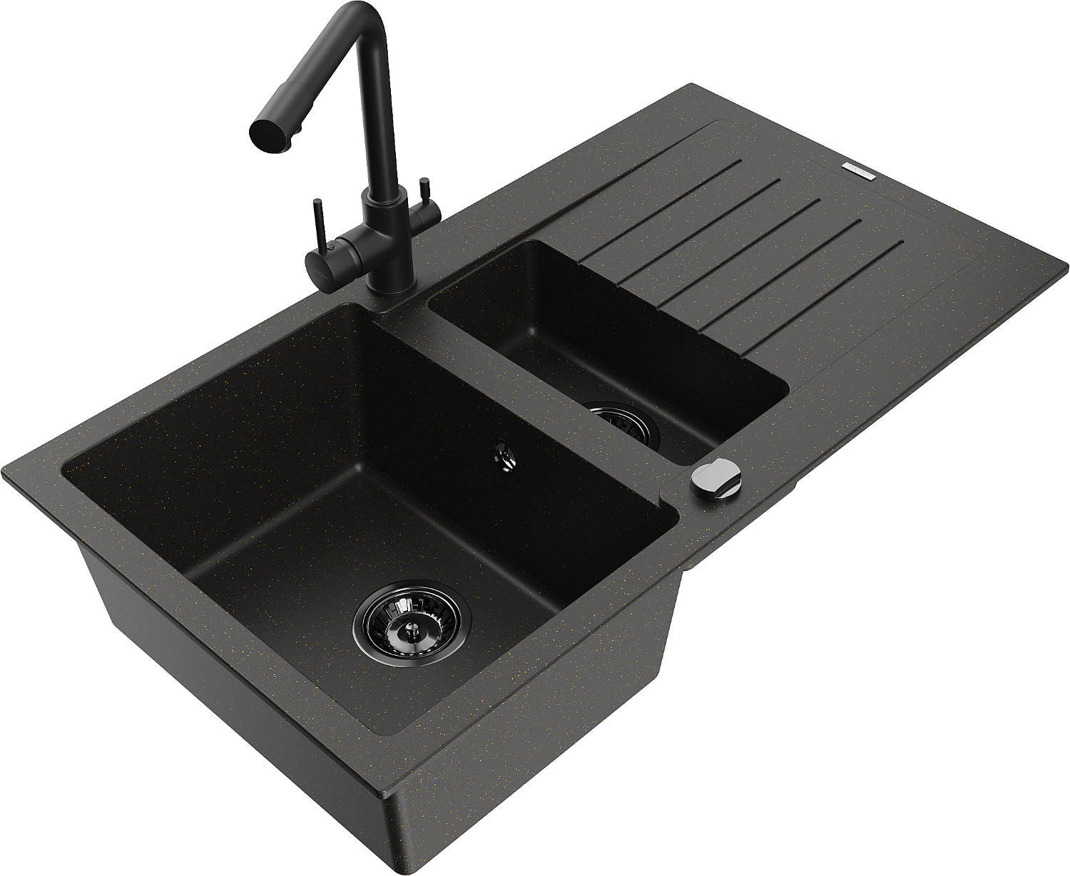 Mexen Matias évier en granit 1,5 bac avec égouttoir et robinet de cuisine Duero, noir/doré - 6502-75-671600-70-B