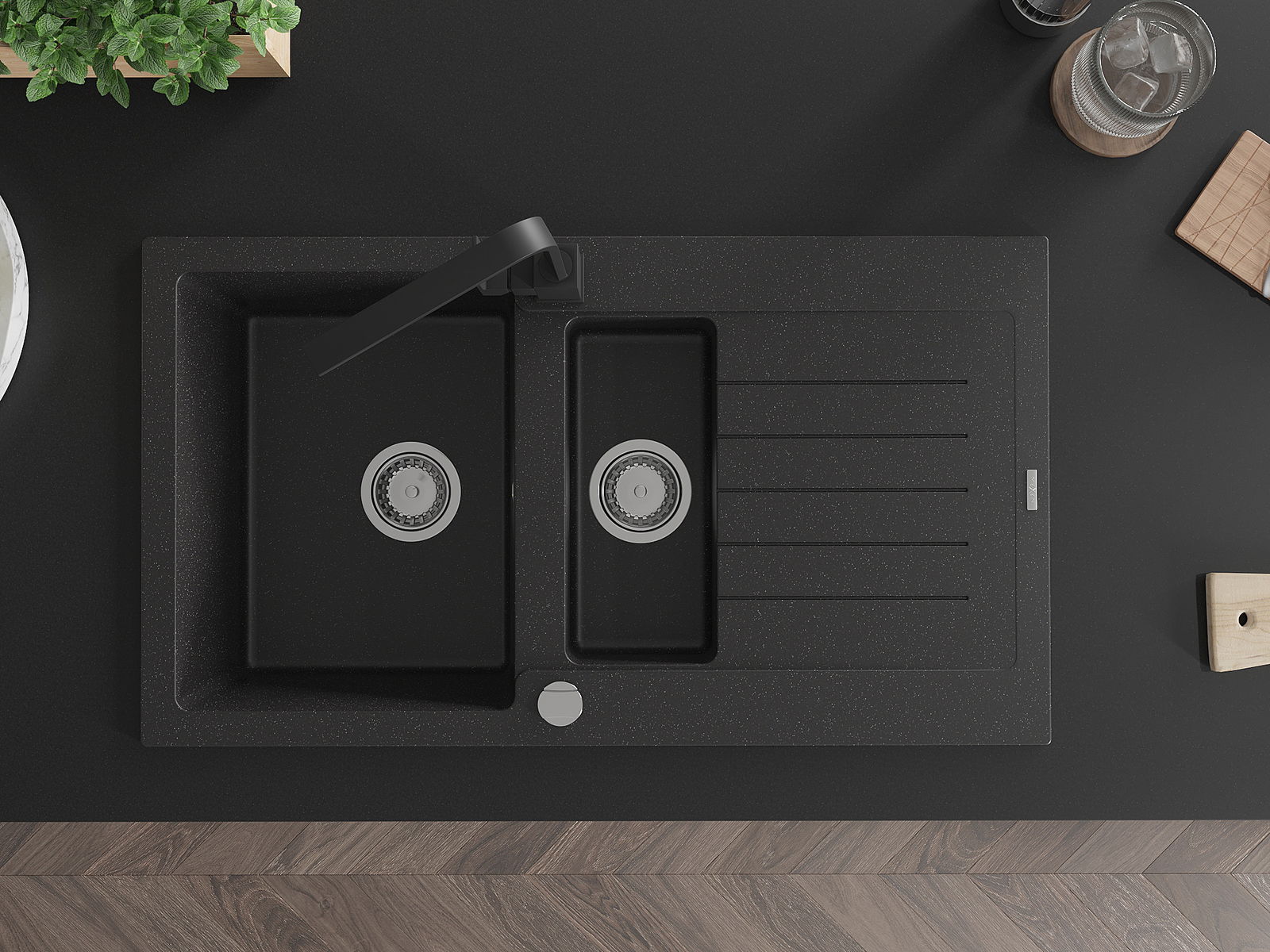 Mexen Matias évier en granit 1,5 cuves avec égouttoir et robinet de cuisine Rita, noir/métallique argent - 6502-73-670300-70