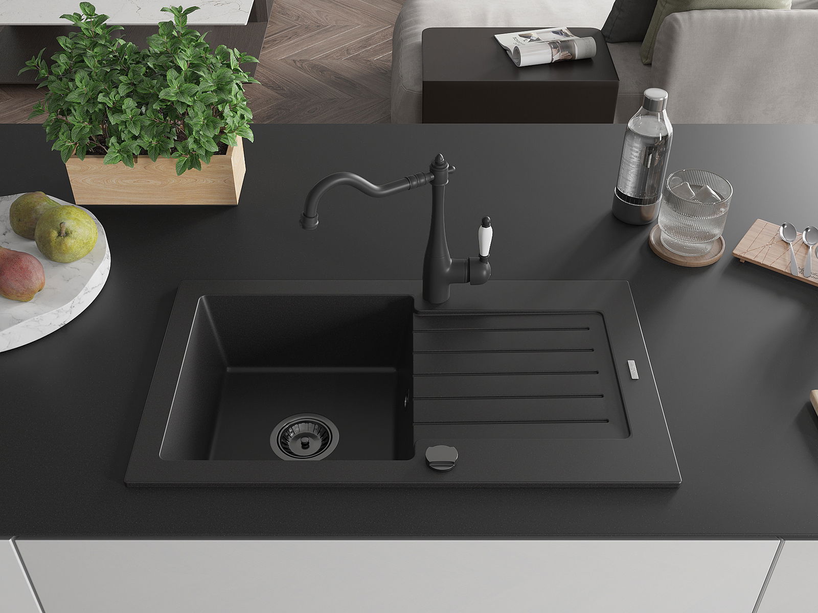 Mexen Pablo évier de cuisine en granit 1 bac avec égouttoir et robinet Carla, noir - 6510-77-670700-70-B