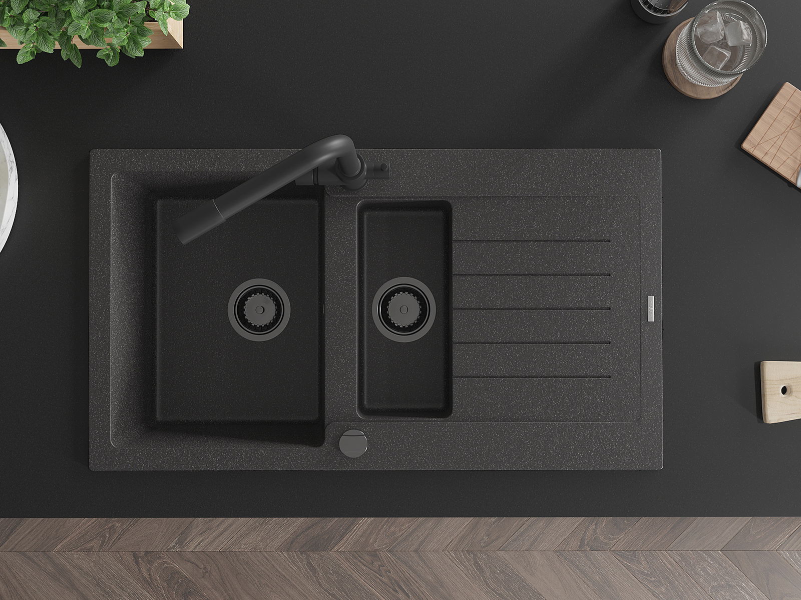 Mexen Matias évier en granit 1,5-bac avec égouttoir et robinet de cuisine Duero, noir moucheté - 6502-76-671600-70-B