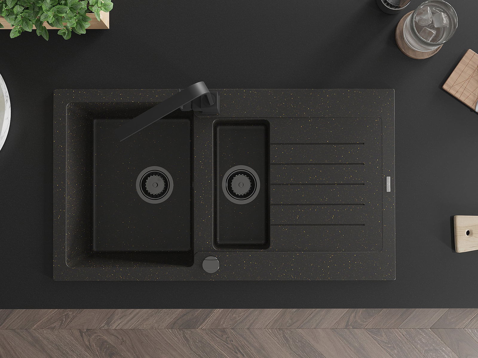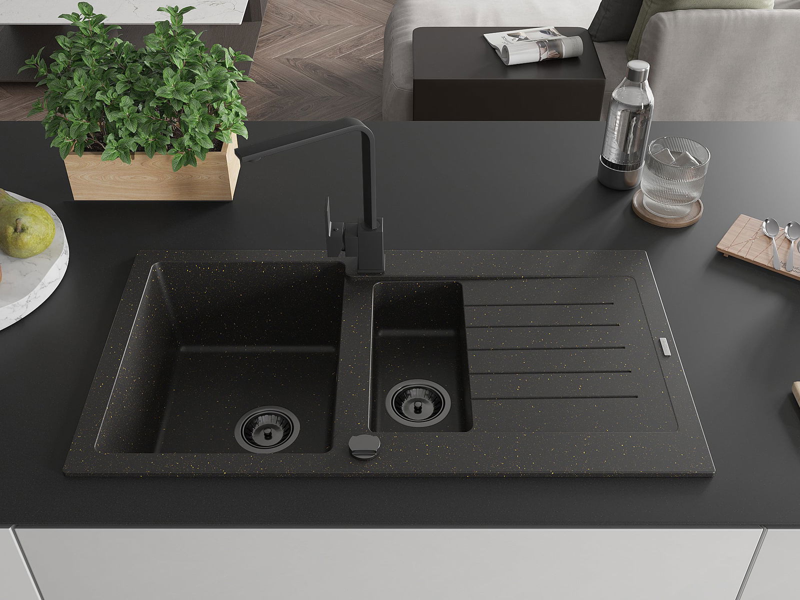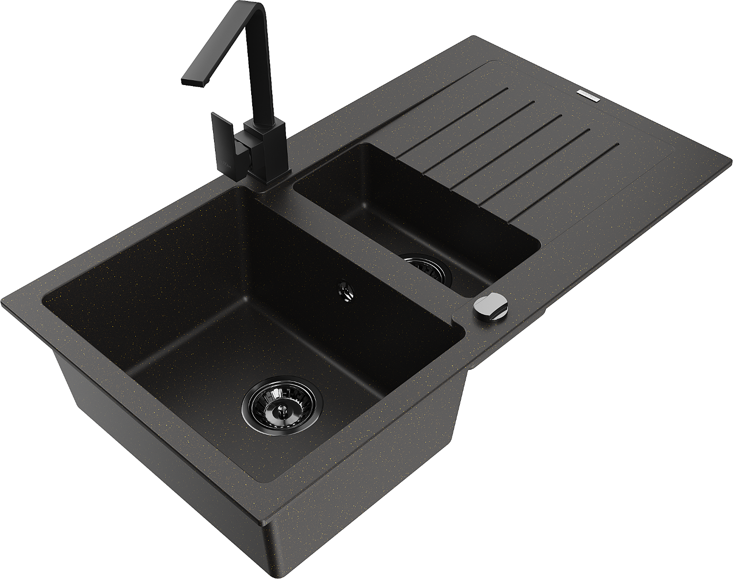 Mexen Matias évier en granit à 1,5 bac avec égouttoir et robinet de cuisine Rita, noir/doré - 6502-75-670300-70-B