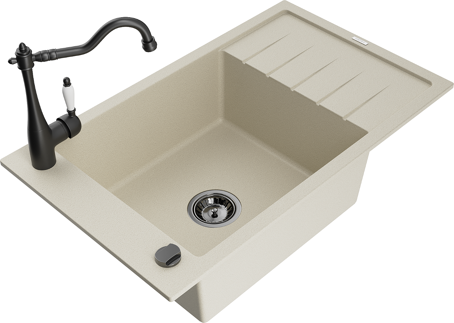 Mexen Elias évier en granit 1 bac avec égouttoir et robinet de cuisine Carla, beige - 6511-69-670700-70