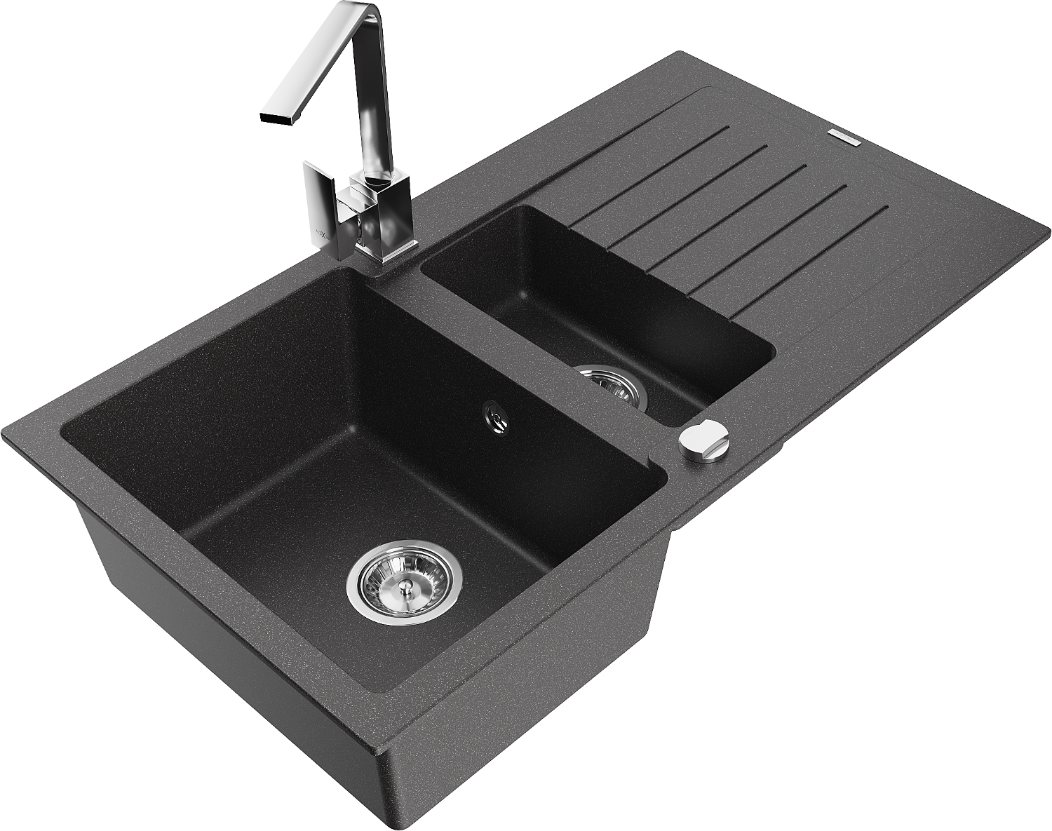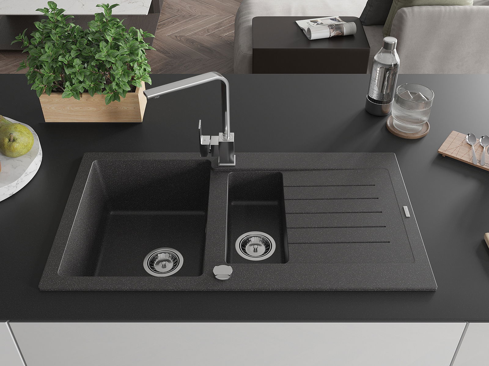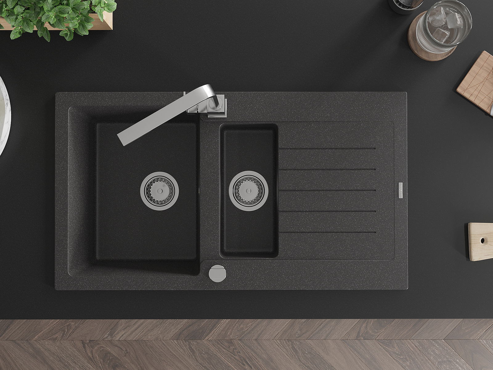 Mexen Matias évier en granit 1,5 bac avec égouttoir et mitigeur de cuisine Rita, noir moucheté - 6502-76-670300-00