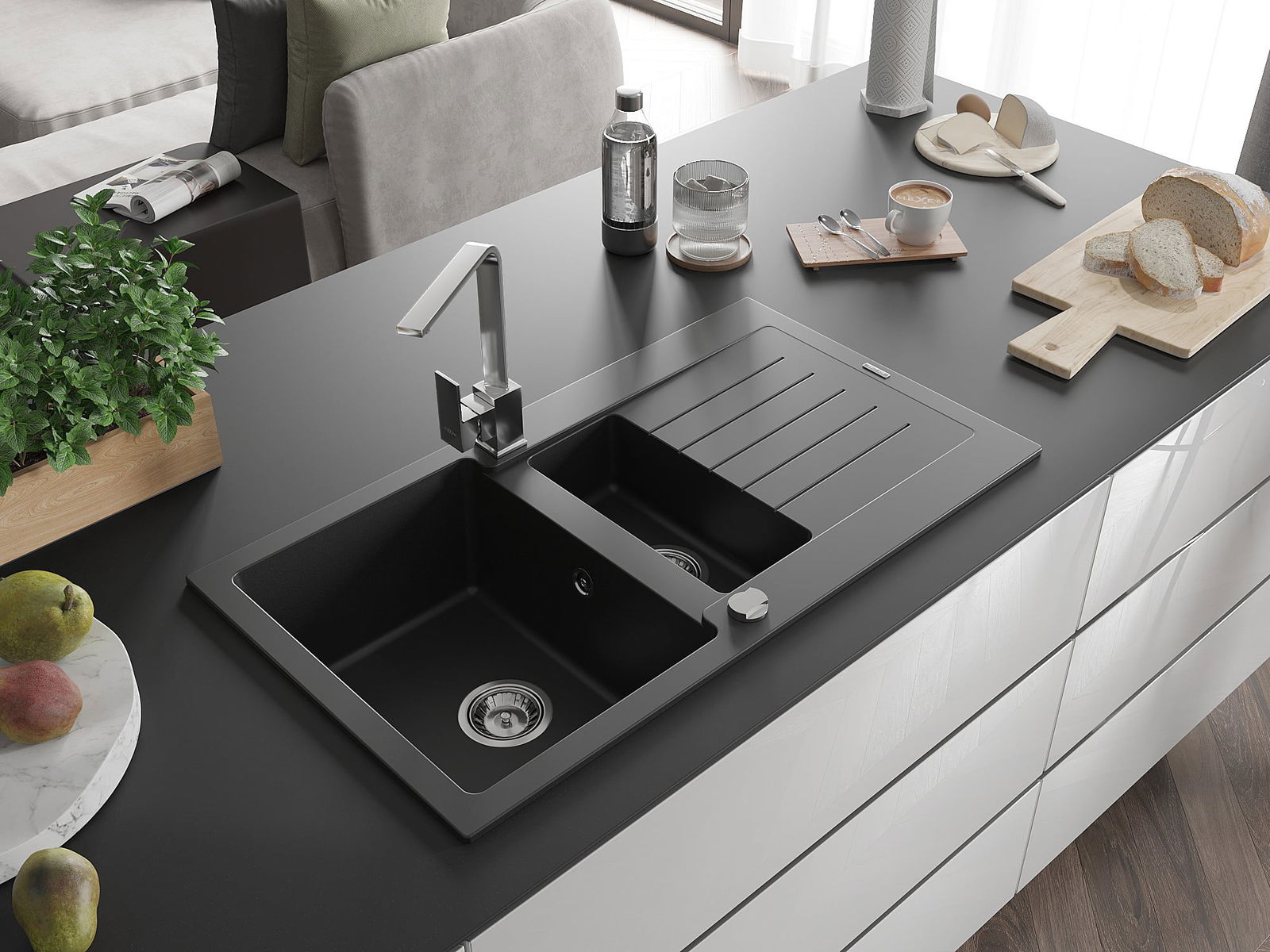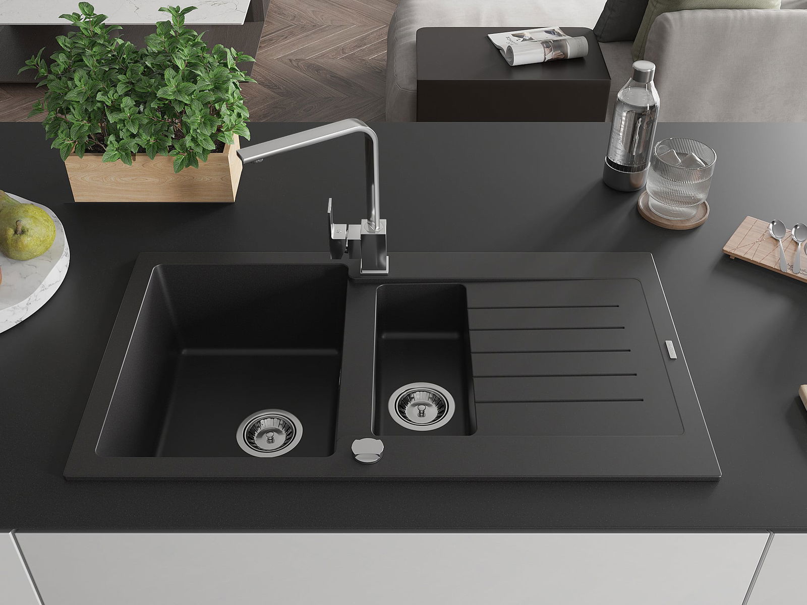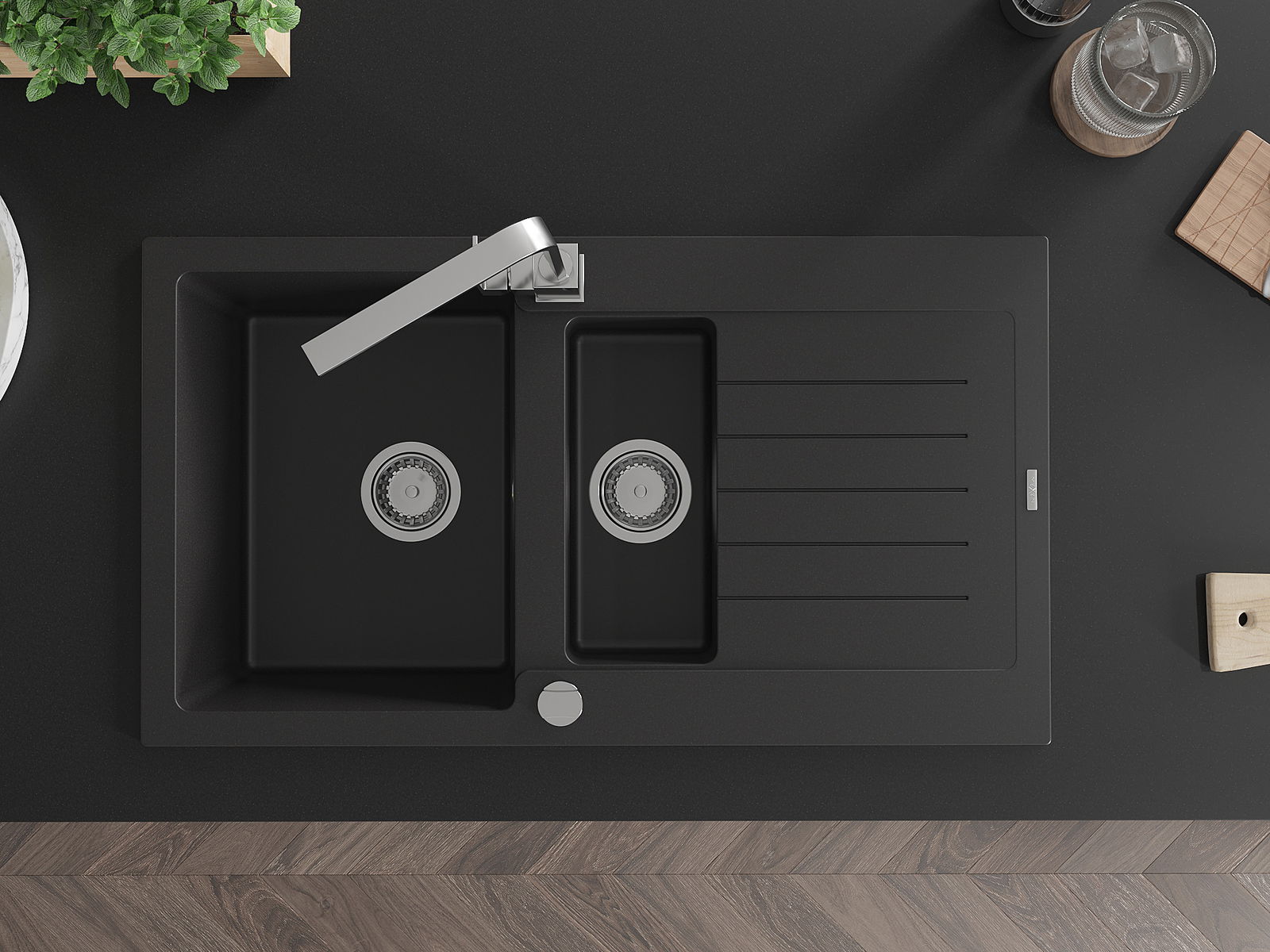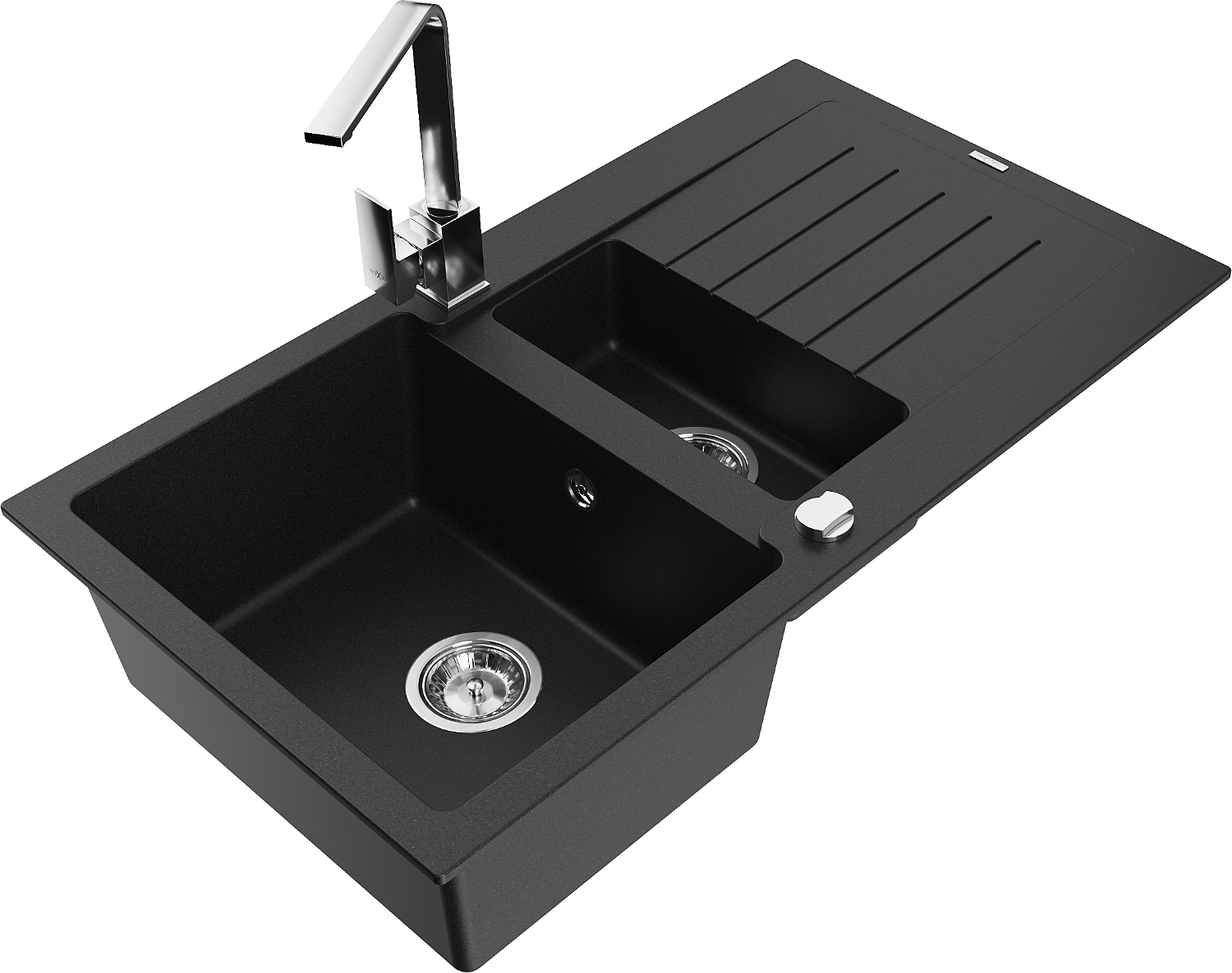 Mexen Matias évier en granit 1,5 bac avec égouttoir et robinet de cuisine Rita, noir - 6502-77-670300-00