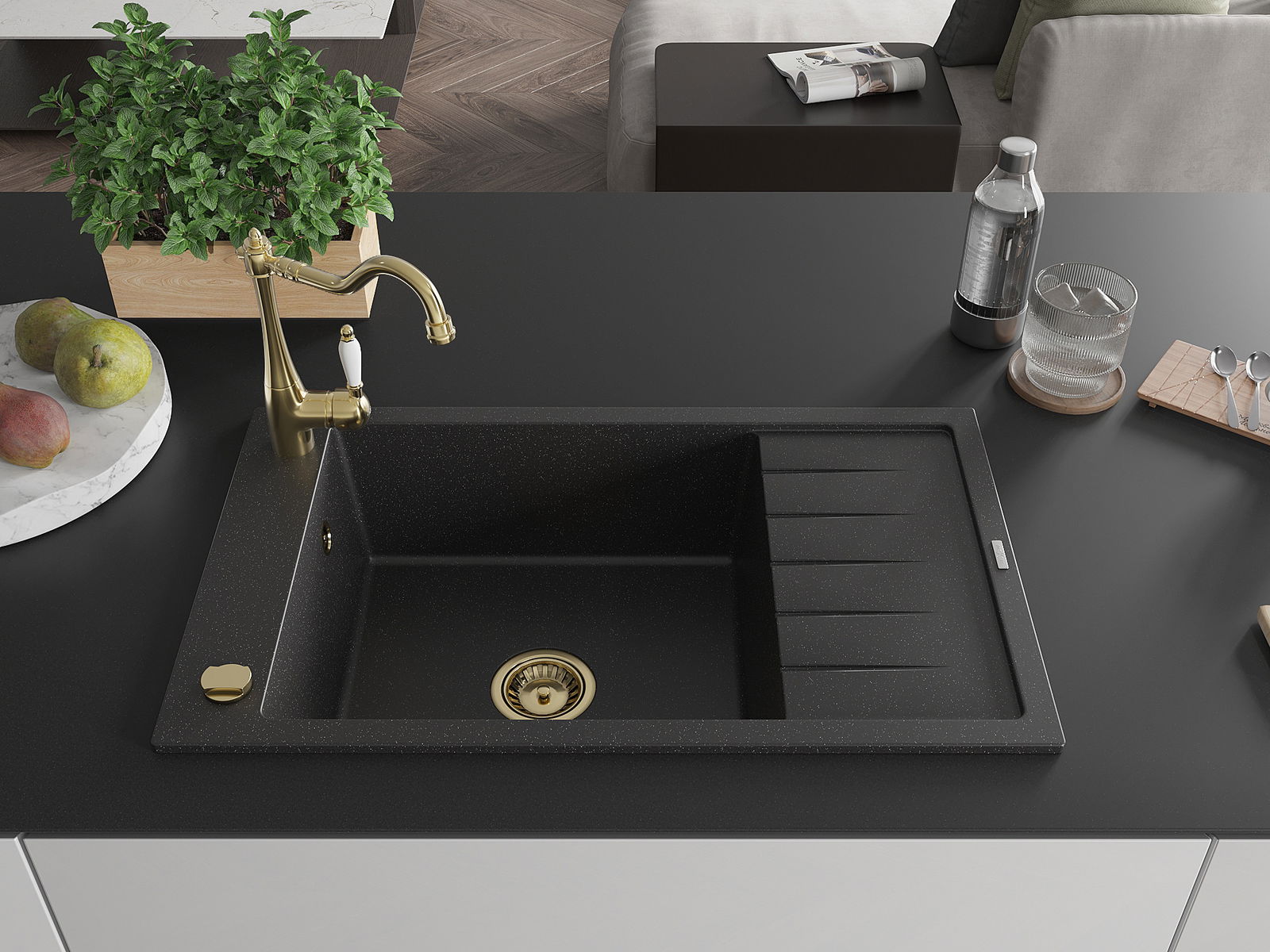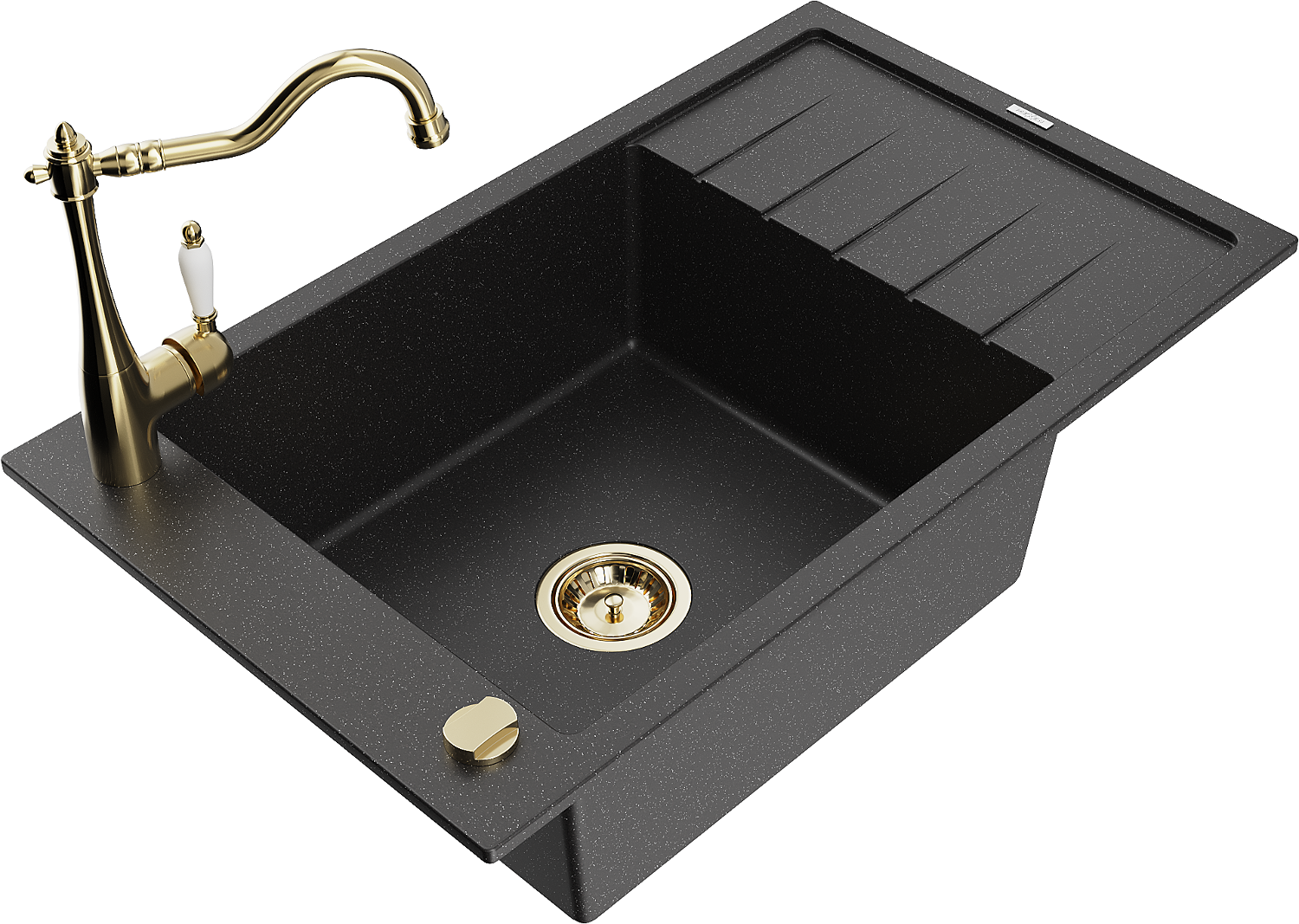 Mexen Elias évier en granit 1 bac avec égouttoir et robinet de cuisine Carla, noir/métallique argenté - 6511-73-670700-50