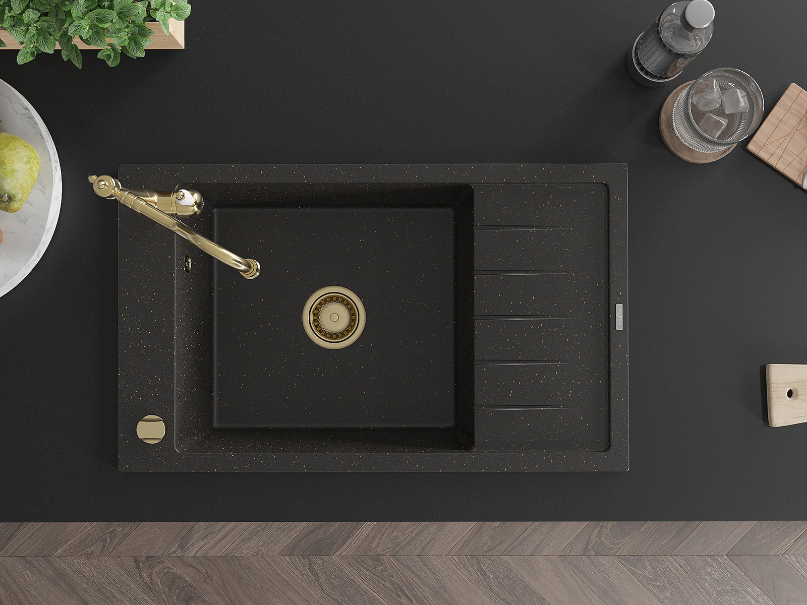 Mexen Elias évier en granit 1 bac avec égouttoir et robinet de cuisine Carla, noir/doré métallisé - 6511-75-670700-50