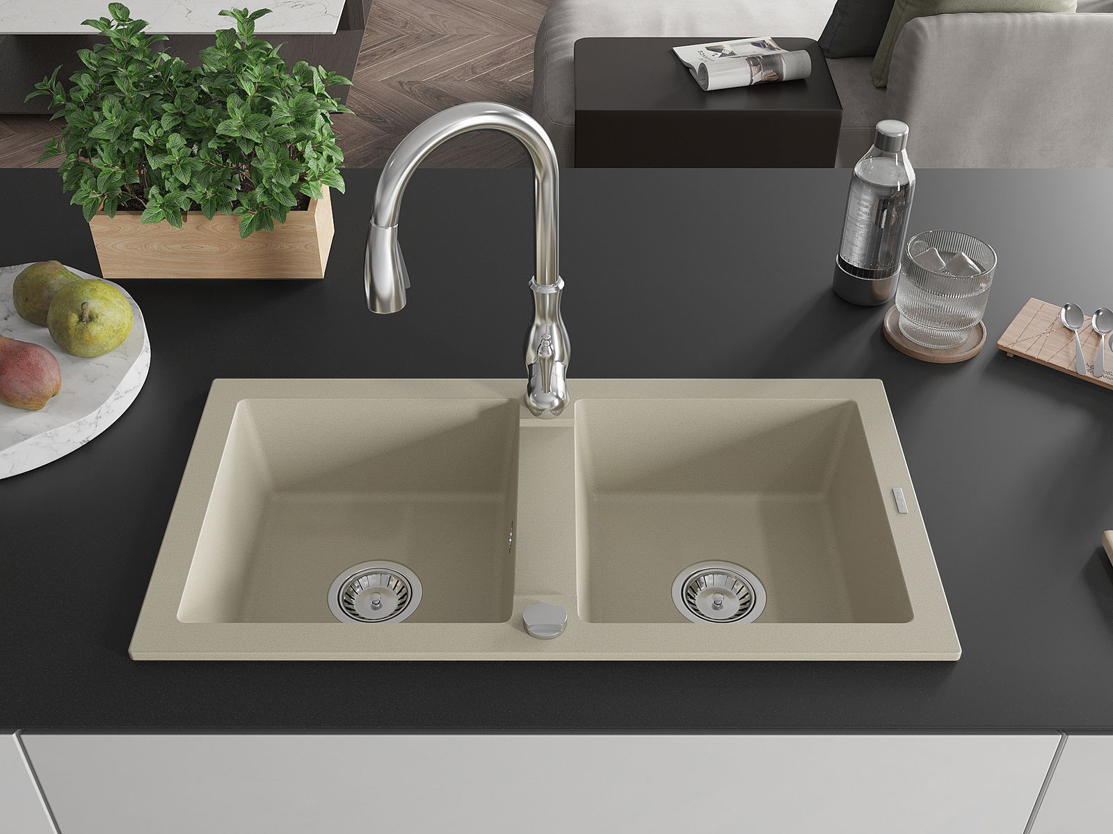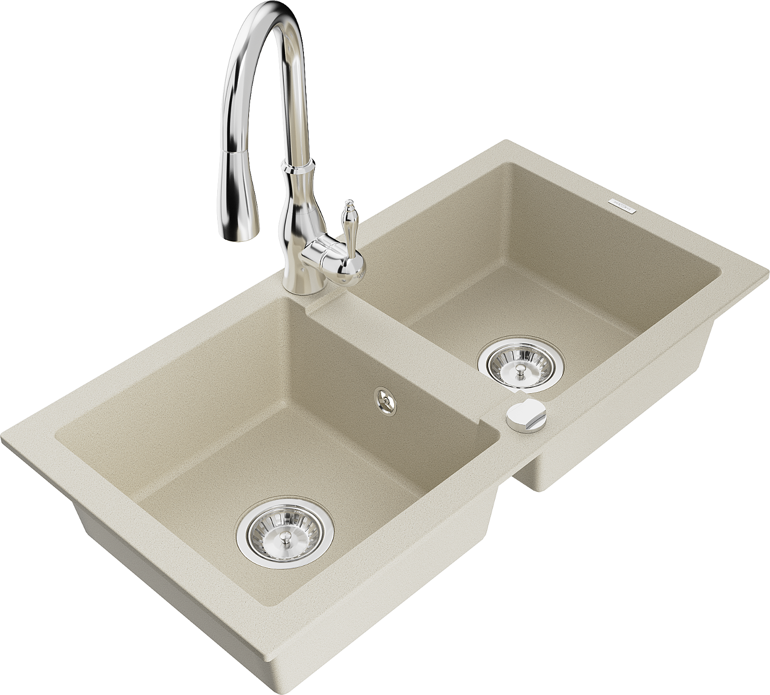 Mexen Mario évier en granit 2 bacs avec robinet de cuisine Savita, beige - 6504-69-672601-00