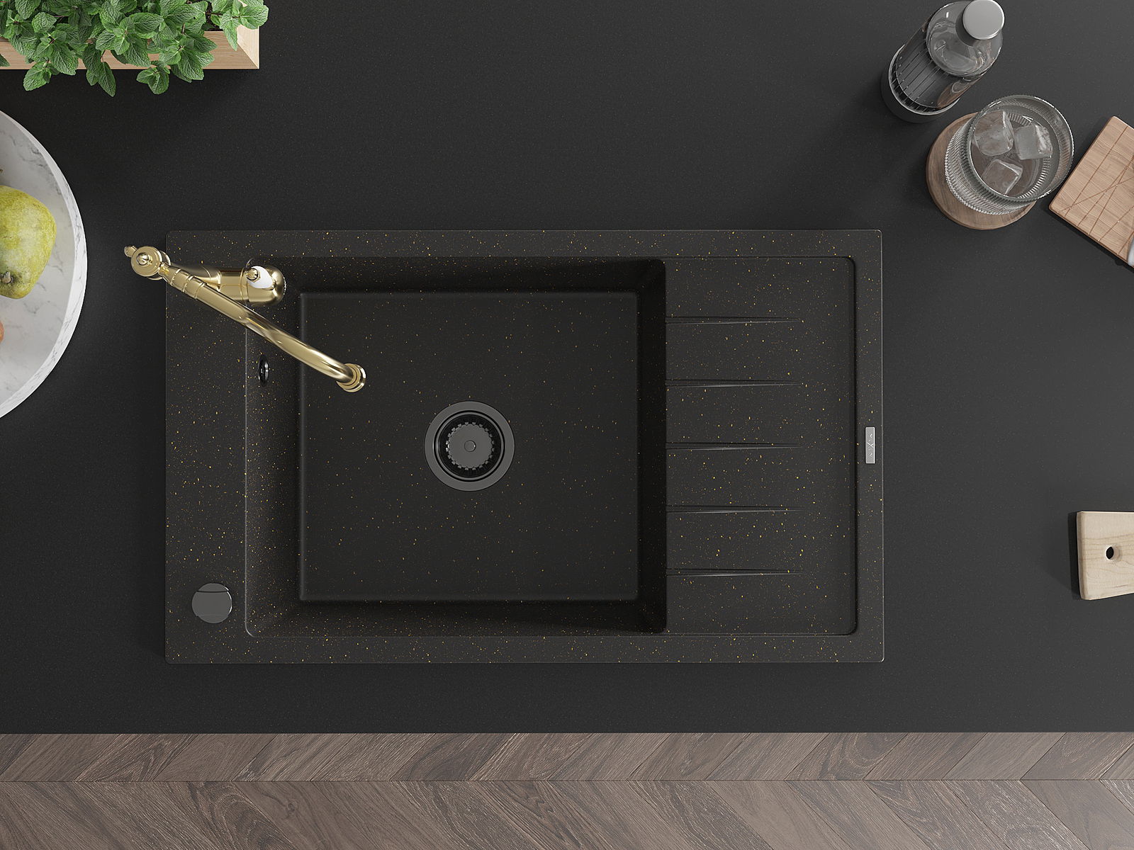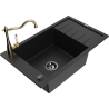 Mexen Elias évier en granit 1 bac avec égouttoir et robinet de cuisine Carla, noir/or métallisé - 6511-75-670700-50-B