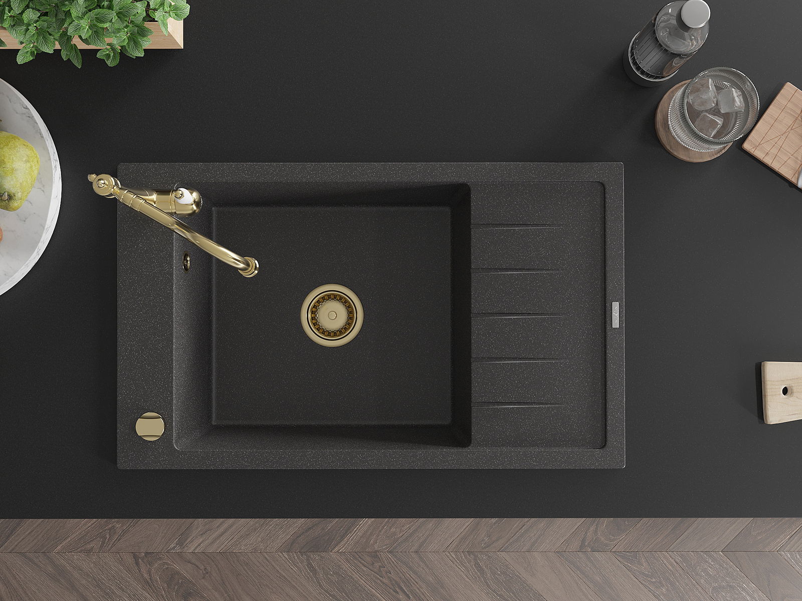 Mexen Elias évier en granit 1 bac avec égouttoir et robinet de cuisine Carla, noir moucheté - 6511-76-670700-50