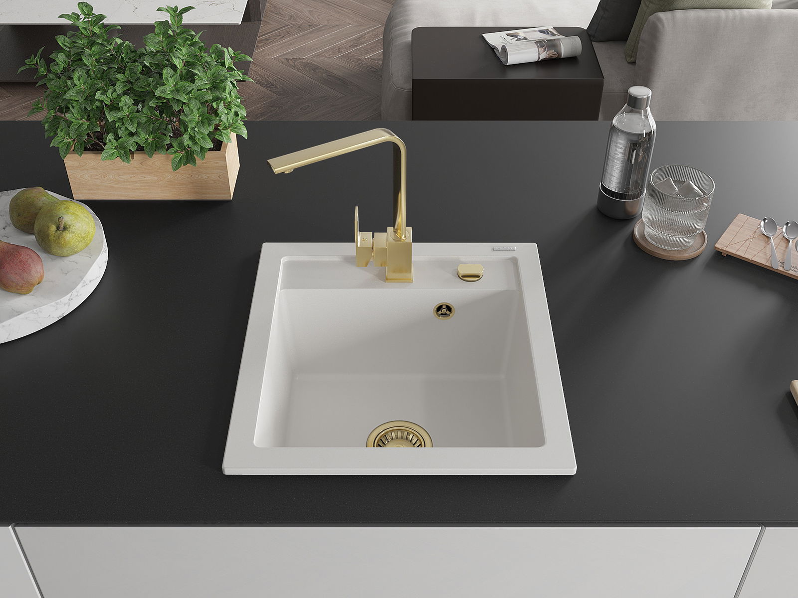 L'évier a un trou sous-meulé de 35 mm de diamètre à percer soi-même. Il peut être utilisé, entre autres, pour installer un distributeur de liquide, ce qui éliminera la présence de bouteilles en plastique dans la cuisine et lui donnera une finition élégante.