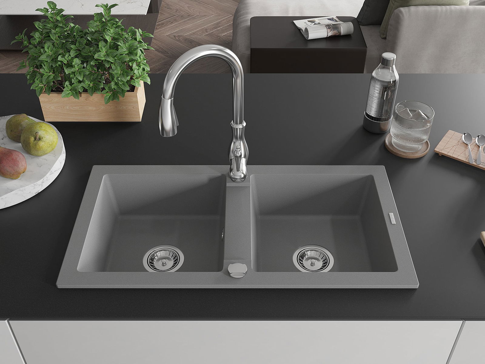 Mexen Mario évier en granit 2 bacs avec mitigeur de cuisine Savita, gris - 6504-71-672601-00