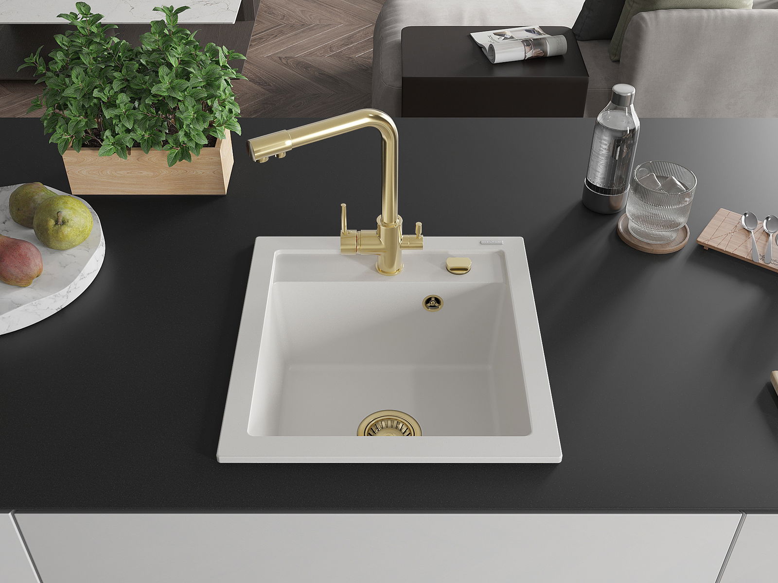 L'évier a un trou sous-meulé de 35 mm de diamètre à percer soi-même. Il peut être utilisé, entre autres, pour installer un distributeur de liquide, ce qui éliminera la présence de bouteilles en plastique dans la cuisine et lui donnera une finition élégante.