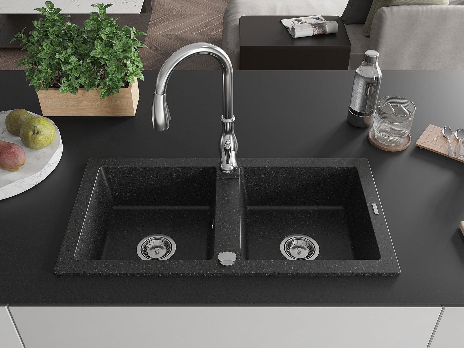 Mexen Mario évier en granit 2 bacs avec robinet de cuisine Savita, noir/argent métallisé - 6504-73-672601-00