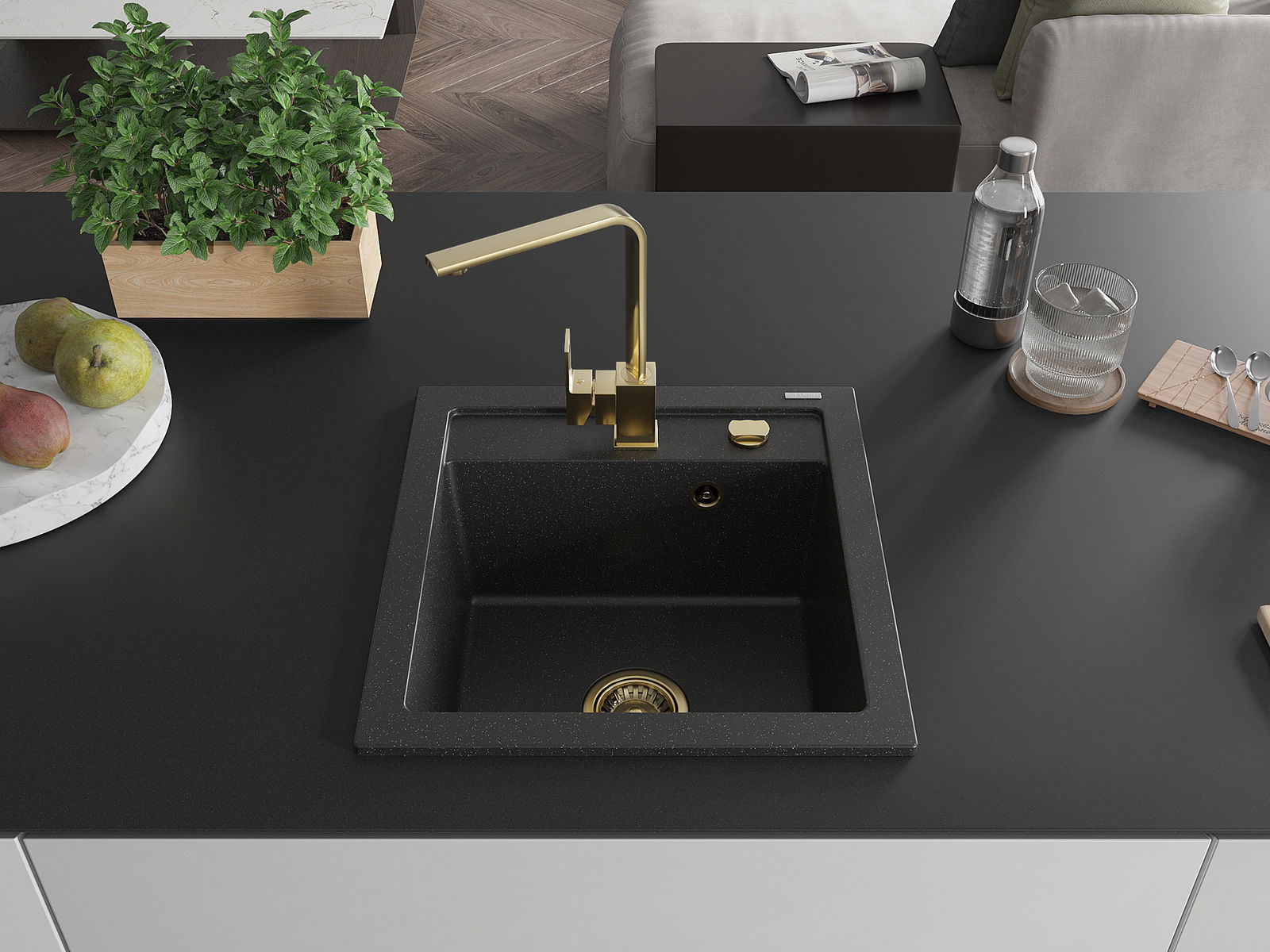 L'évier a un trou sous-meulé de 35 mm de diamètre à percer soi-même. Il peut être utilisé, entre autres, pour installer un distributeur de liquide, ce qui éliminera la présence de bouteilles en plastique dans la cuisine et lui donnera une finition élégante.