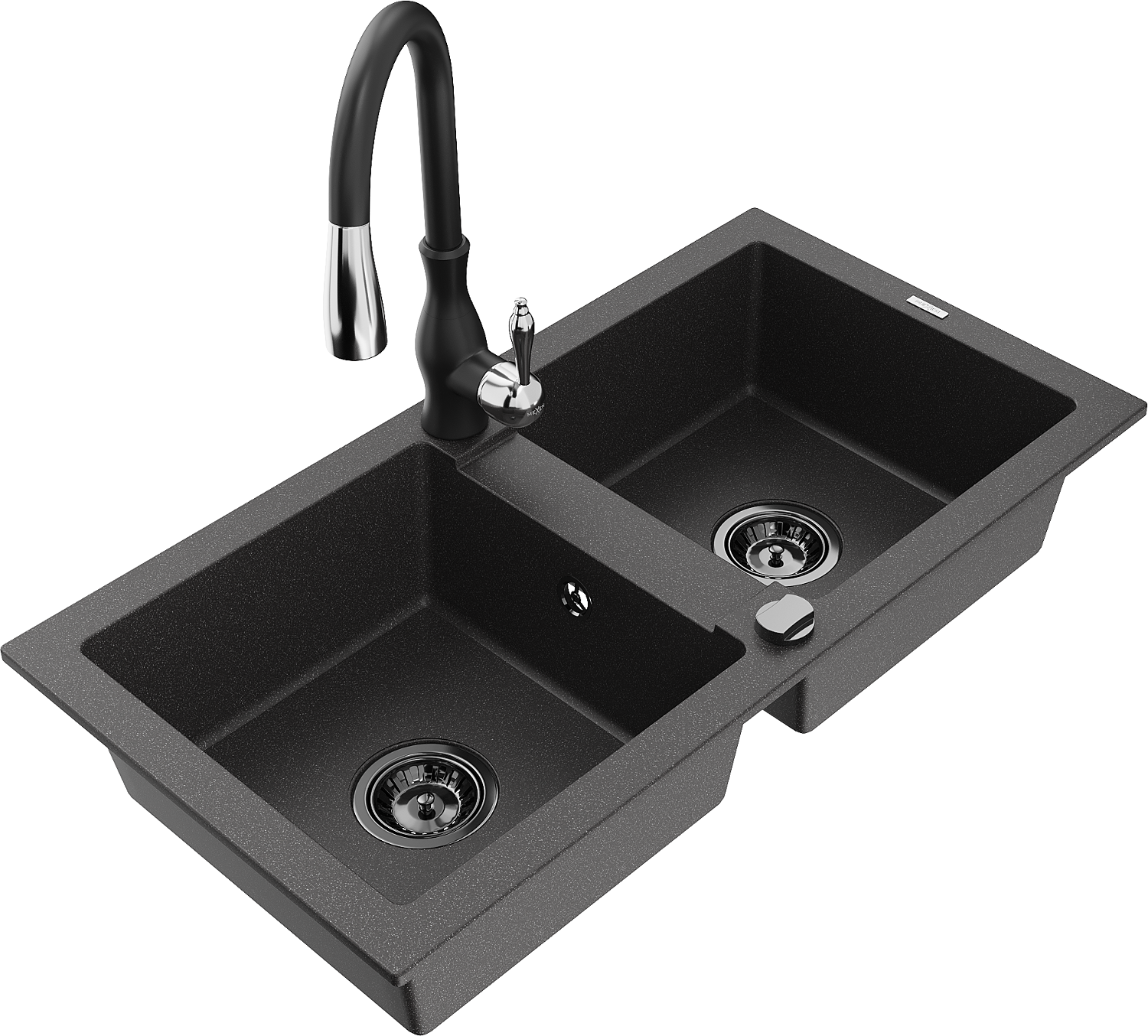 Mexen Mario évier en granit à 2 bacs avec robinet de cuisine Savita, noir moucheté - 6504-76-672601-70-B