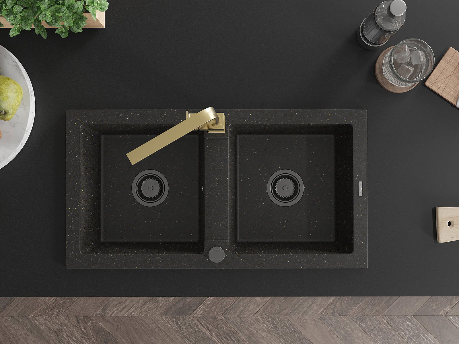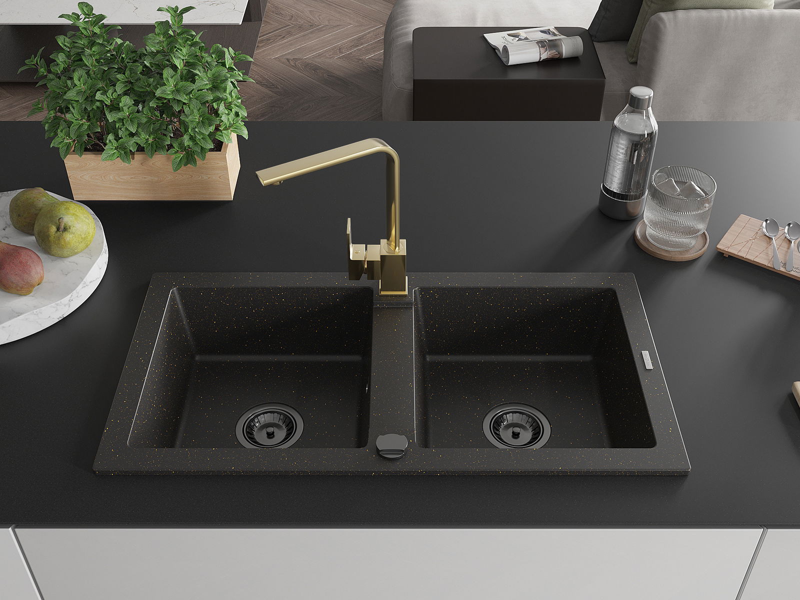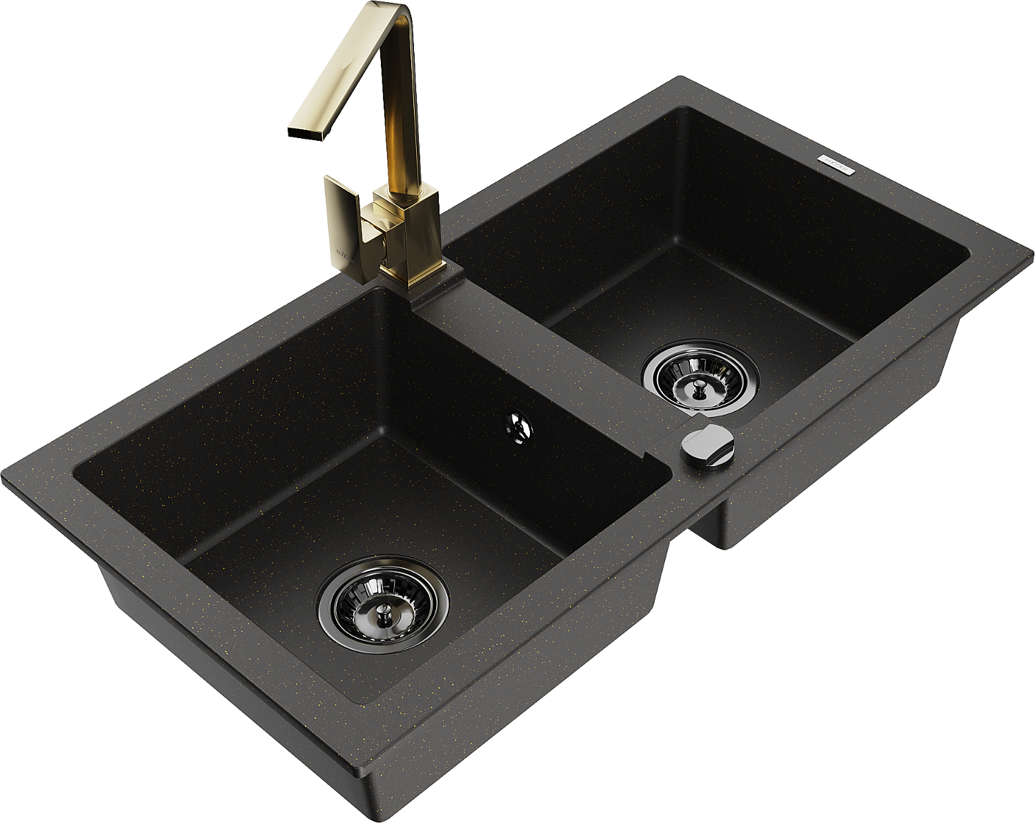 Mexen Mario évier en granit à 2 bacs avec mitigeur de cuisine Rita, noir/doré métallisé - 6504-75-670300-50-B