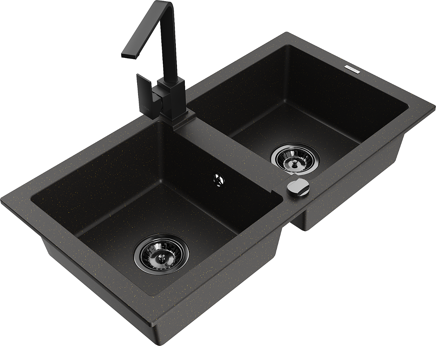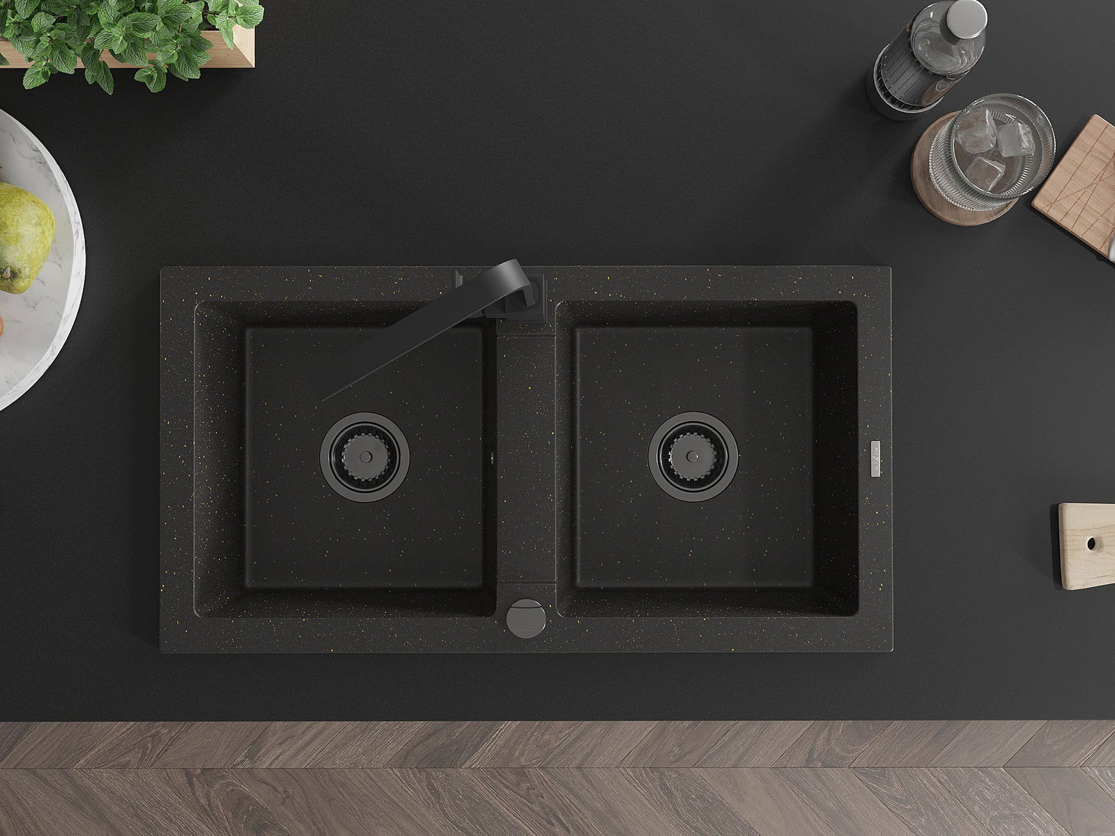 Mexen Mario évier en granit 2 bacs avec mitigeur de cuisine Rita, noir/doré métallisé - 6504-75-670300-70-B