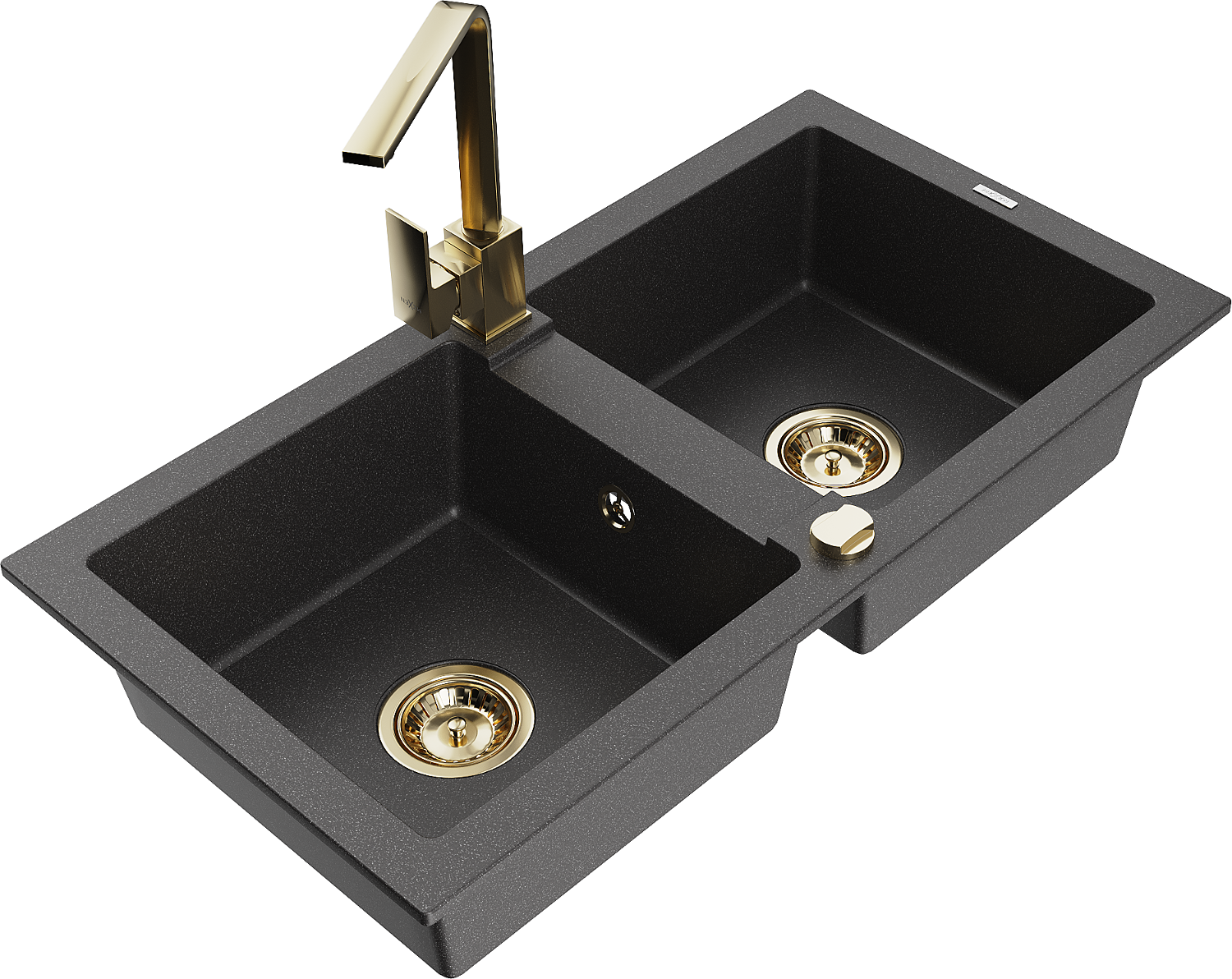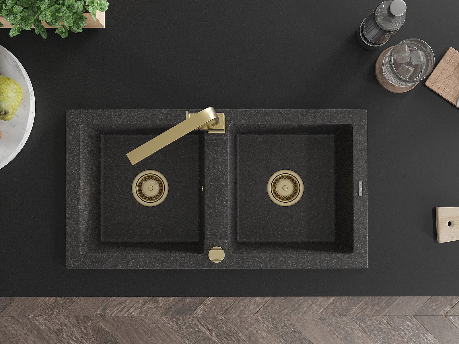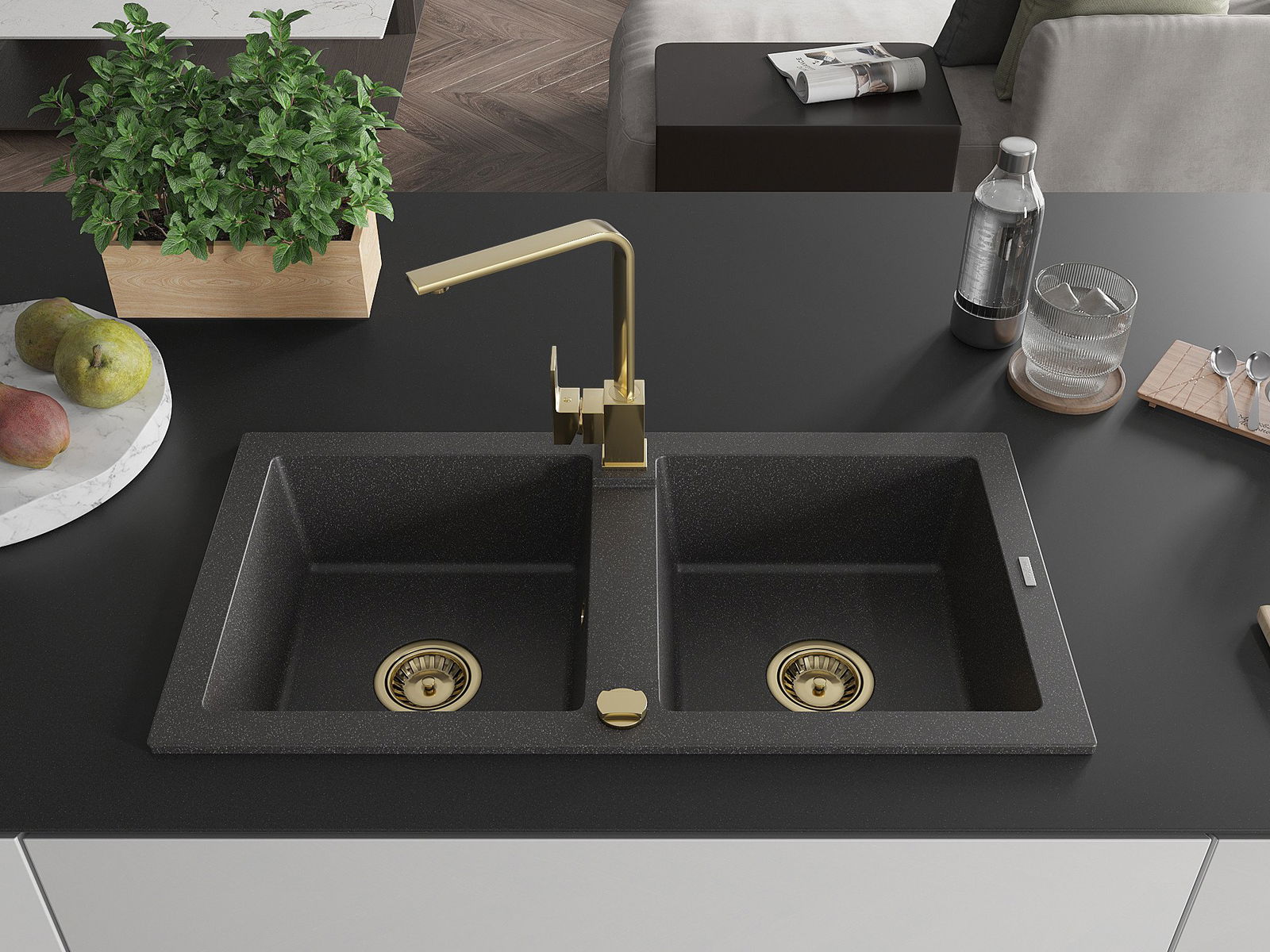 Mexen Mario évier en granit 2 bacs avec robinet de cuisine Rita, noir moucheté - 6504-76-670300-50