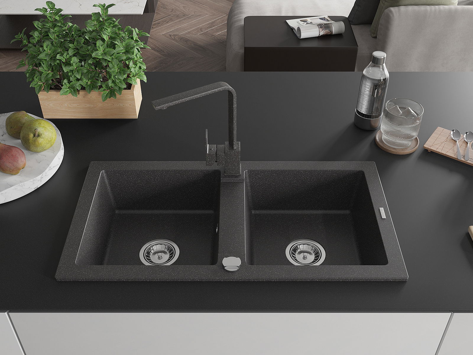 Mexen Mario évier en granit à 2 bacs avec robinet de cuisine Rita, noir moucheté - 6504-76-670300-76