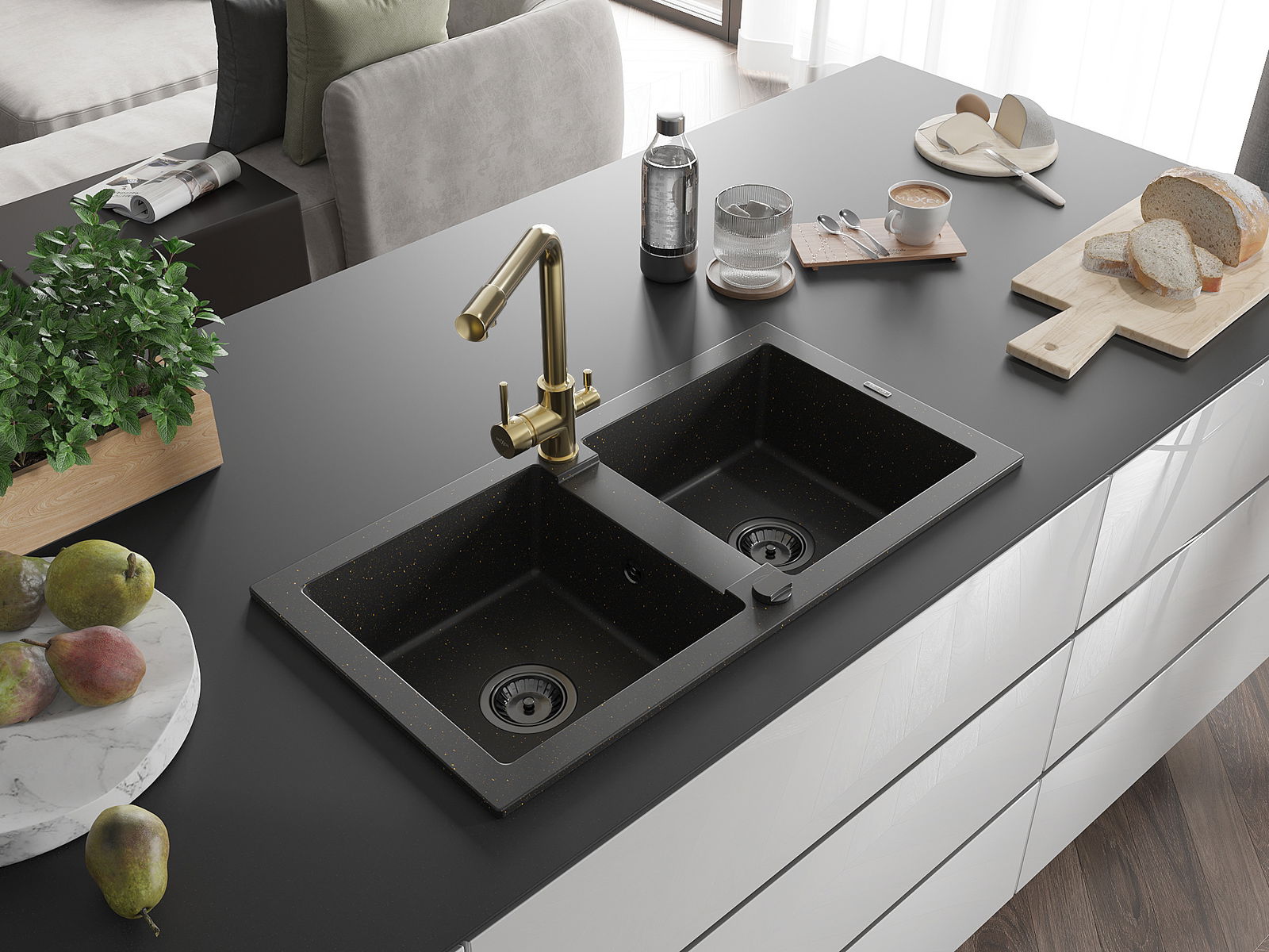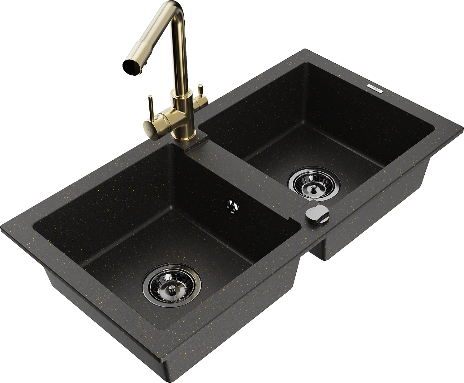 Mexen Mario évier en granit 2 bacs avec robinet de cuisine Duero, noir/or métallique - 6504-75-671600-50-B