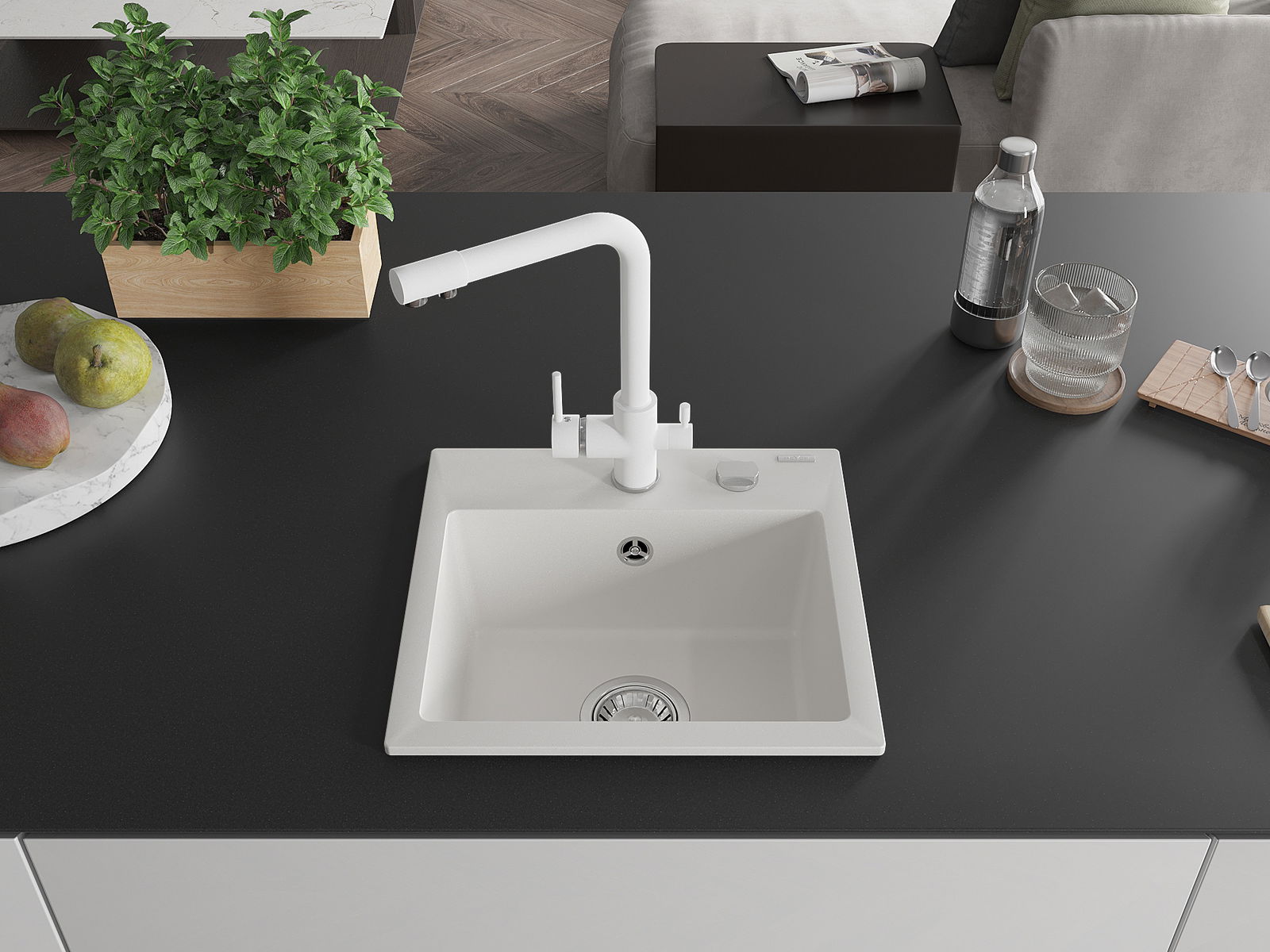 L'évier a un trou sous-meulé de 35 mm de diamètre à percer soi-même. Il peut être utilisé, entre autres, pour installer un distributeur de liquide, ce qui éliminera la présence de bouteilles en plastique dans la cuisine et lui donnera une finition élégante.