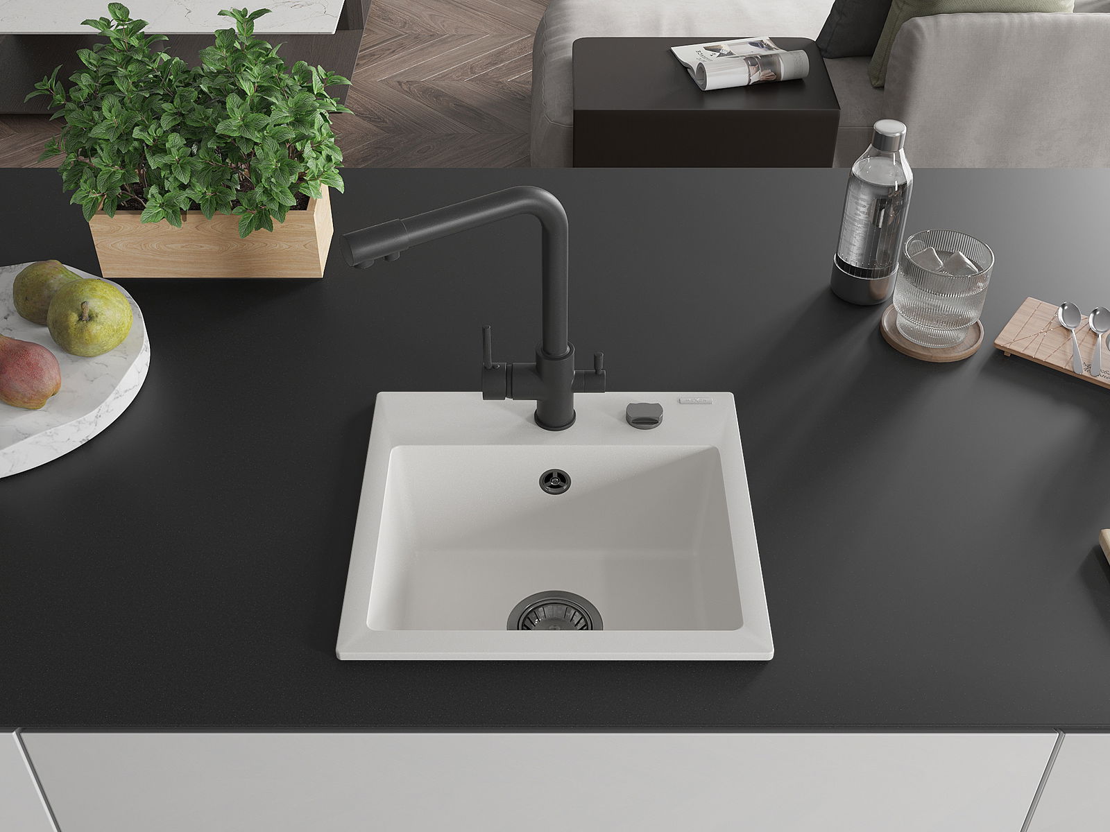 L'évier a un trou sous-meulé de 35 mm de diamètre à percer soi-même. Il peut être utilisé, entre autres, pour installer un distributeur de liquide, ce qui éliminera la présence de bouteilles en plastique dans la cuisine et lui donnera une finition élégante.