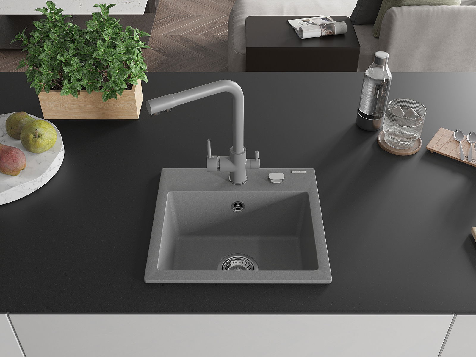 L'évier a un trou sous-meulé de 35 mm de diamètre à percer soi-même. Il peut être utilisé, entre autres, pour installer un distributeur de liquide, ce qui éliminera la présence de bouteilles en plastique dans la cuisine et lui donnera une finition élégante.