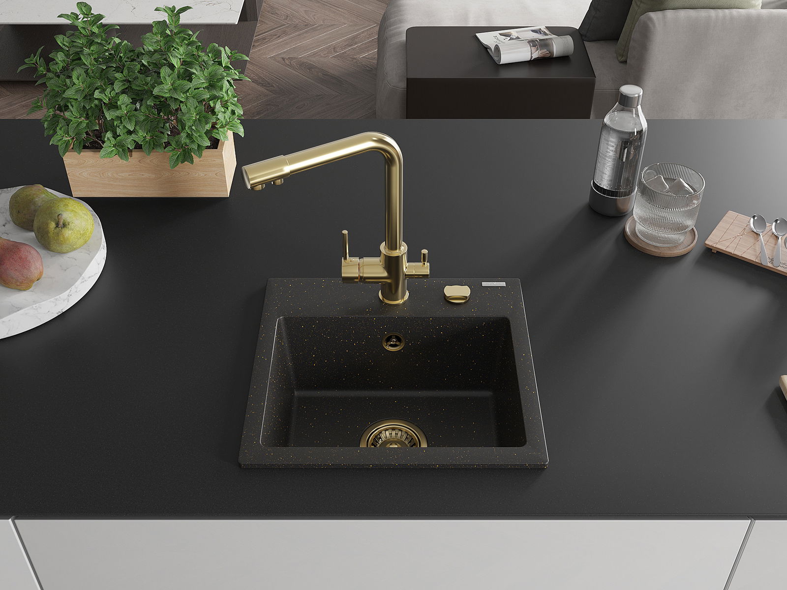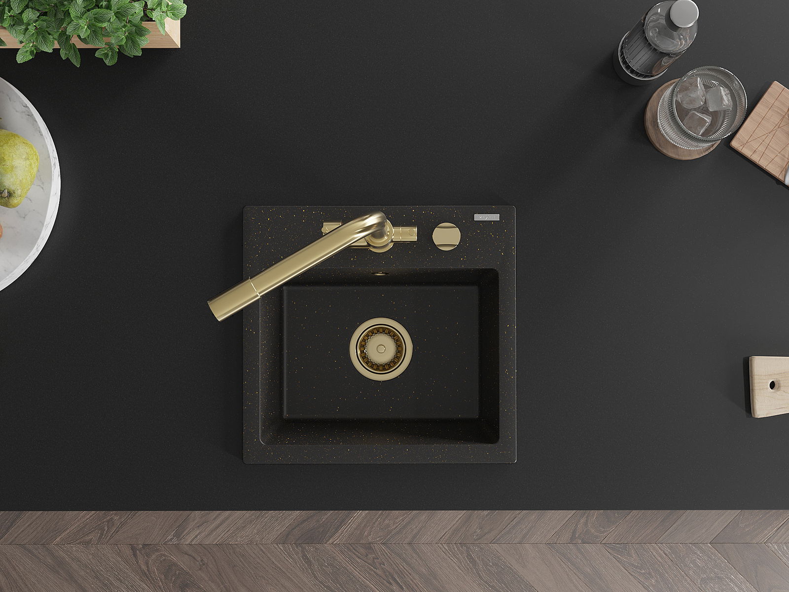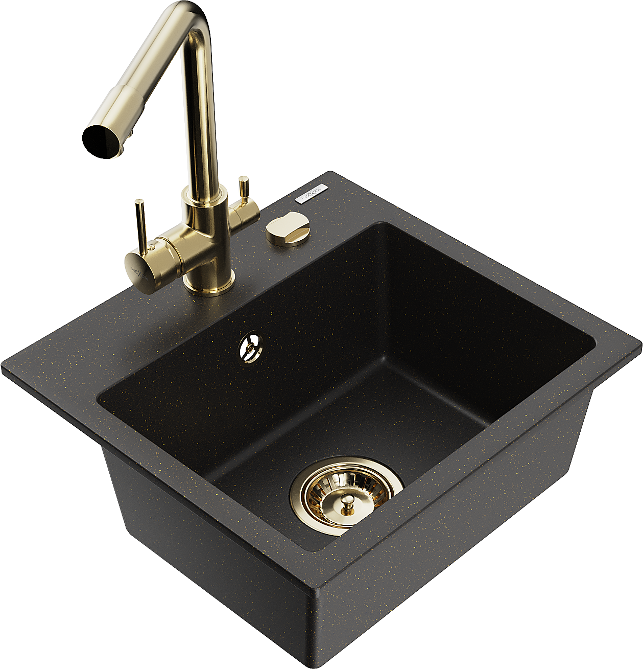 Mexen Milo évier en granit 1 bac avec robinet de cuisine Duero, noir/or métallique - 6505-75-671600-50