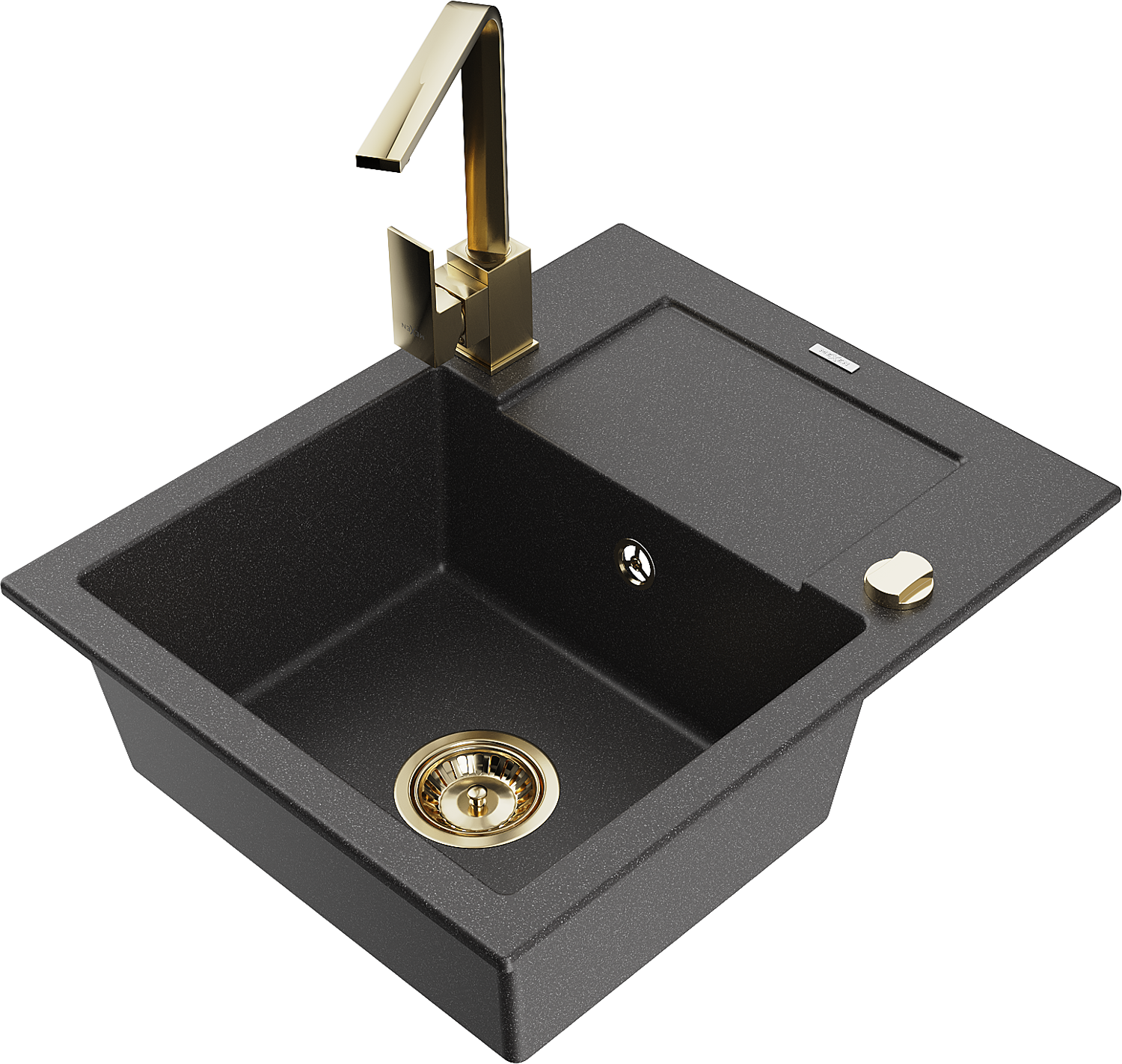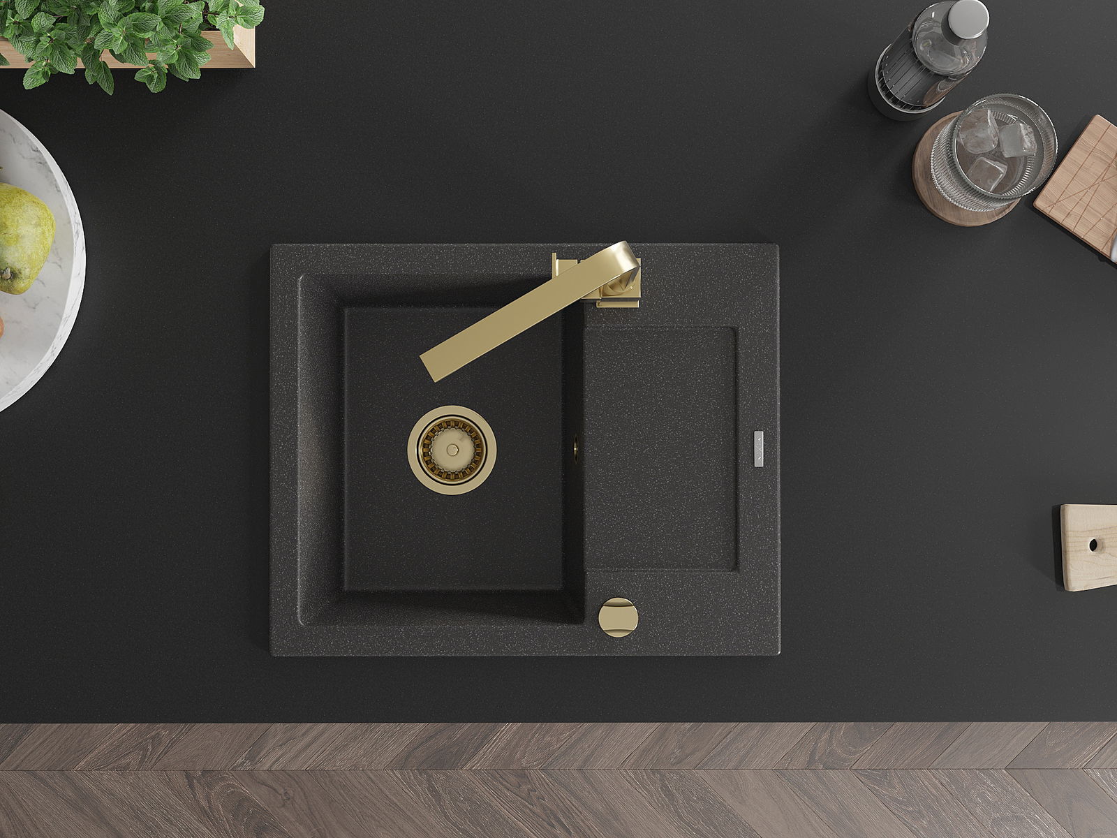 Mexen Enzo évier en granit 1 bac avec égouttoir et mitigeur de cuisine Rita, noir moucheté - 6506-76-670300-50