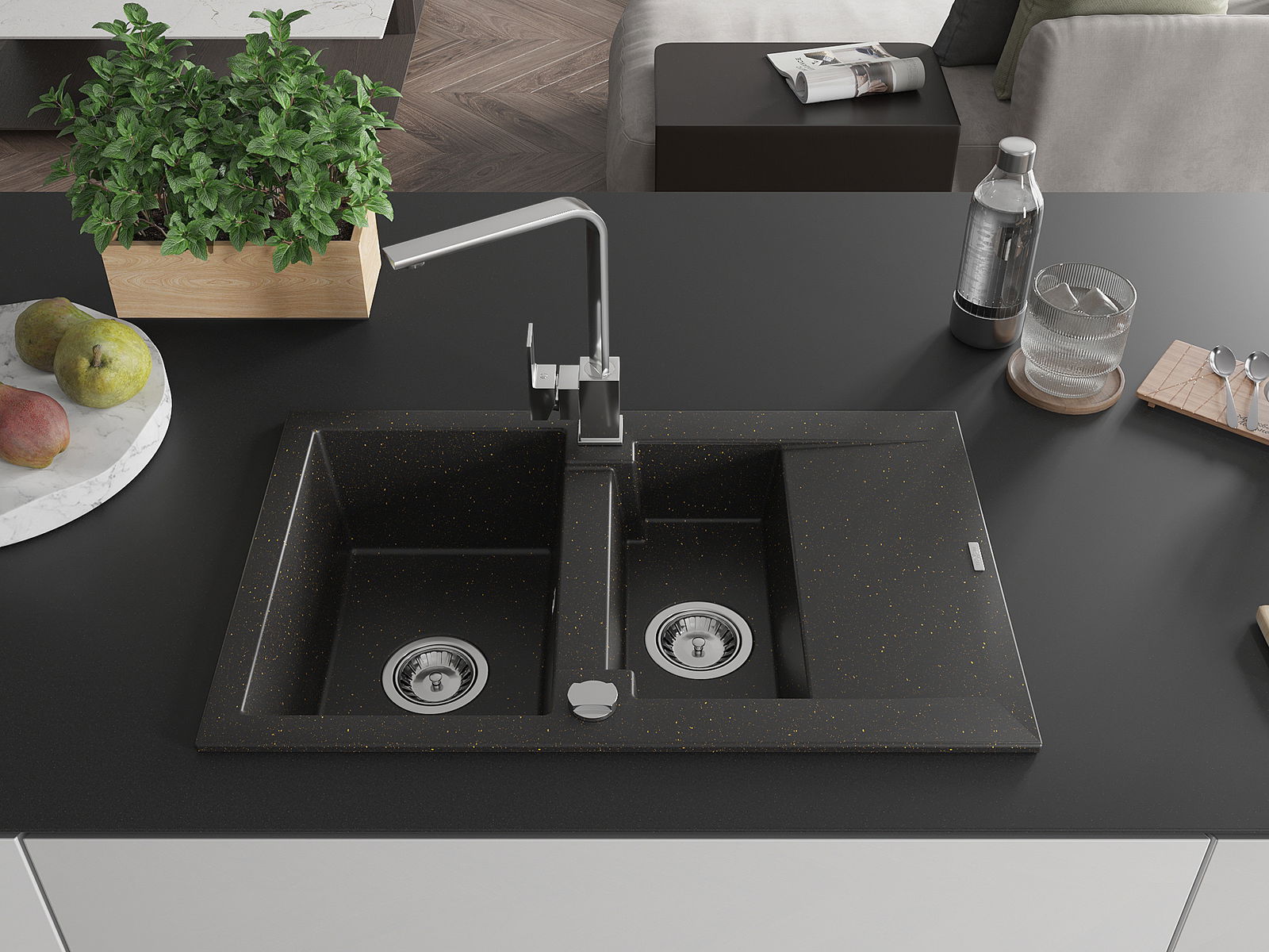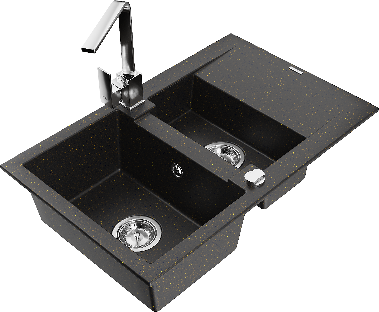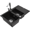 Mexen Gaspar évier en granit 1,5 cuve avec égouttoir et robinet de cuisine Rita, noir/doré - 6507-75-670300-00