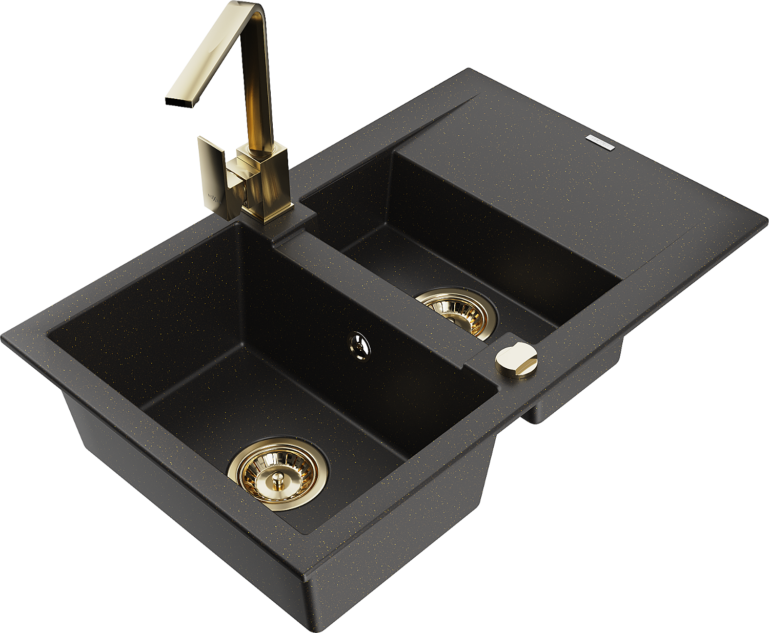 Mexen Gaspar évier en granit 1,5 bac avec égouttoir et robinet de cuisine Rita, noir/or - 6507-75-670300-50