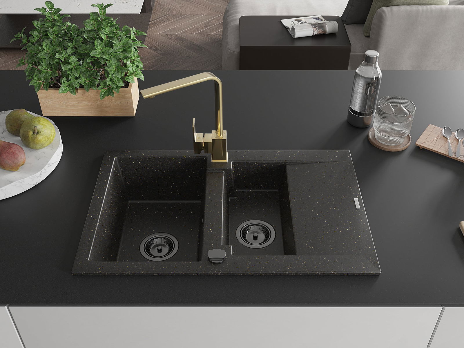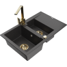 Mexen Gaspar évier en granit 1,5 bac avec égouttoir et mitigeur de cuisine Rita, noir/or - 6507-75-670300-50-B