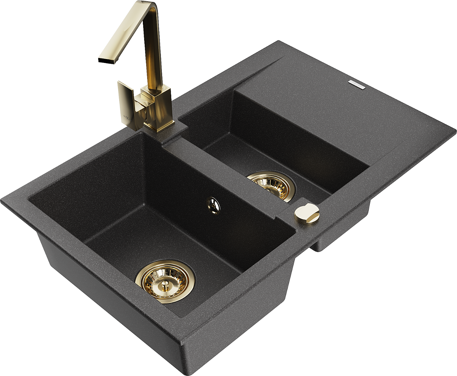 Mexen Gaspar évier en granit 1,5 bac avec égouttoir et robinet de cuisine Rita, noir moucheté - 6507-76-670300-50