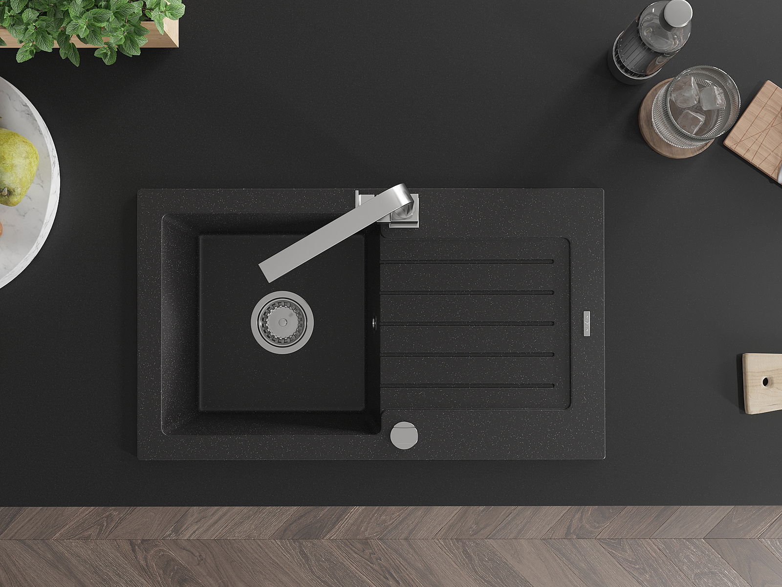 Mexen Pablo évier en granit 1 bac avec égouttoir et robinet de cuisine Rita, noir/argent métallisé- 6510-73-670300-00