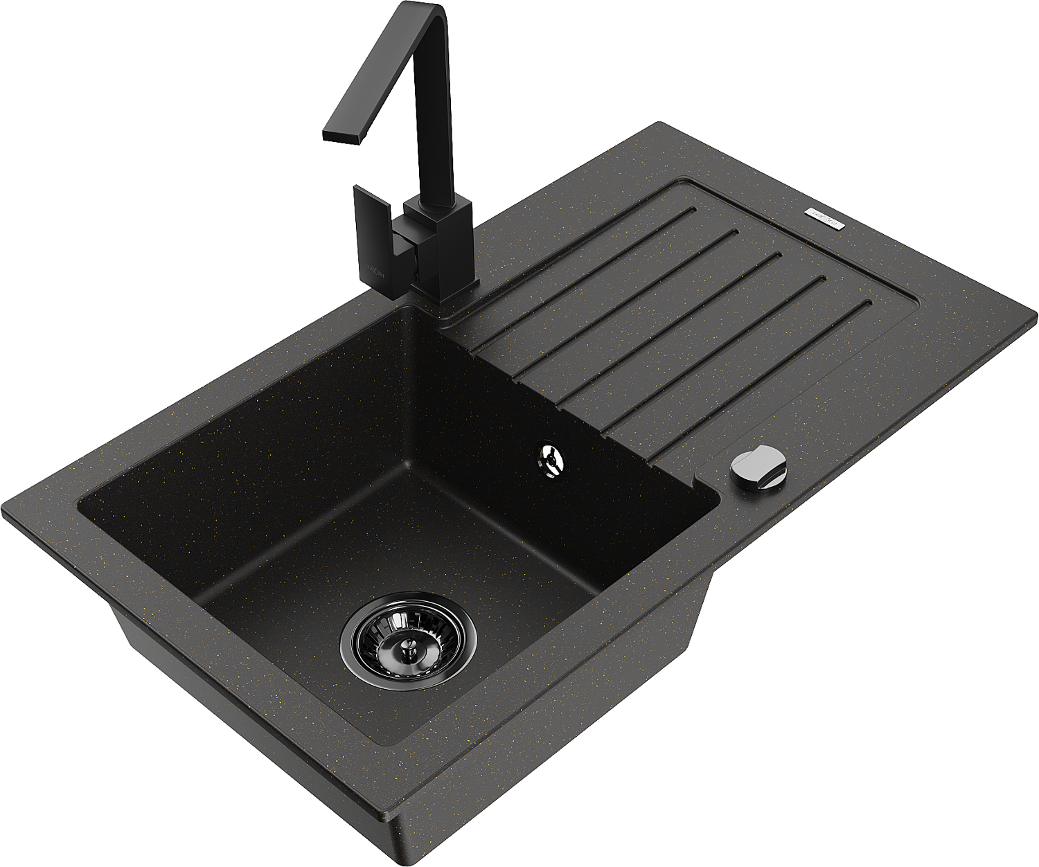 Mexen Pablo évier de cuisine 1 bac en granit avec égouttoir et robinet de cuisine Rita, noir/or métallisé - 6510-75-670300-70-B