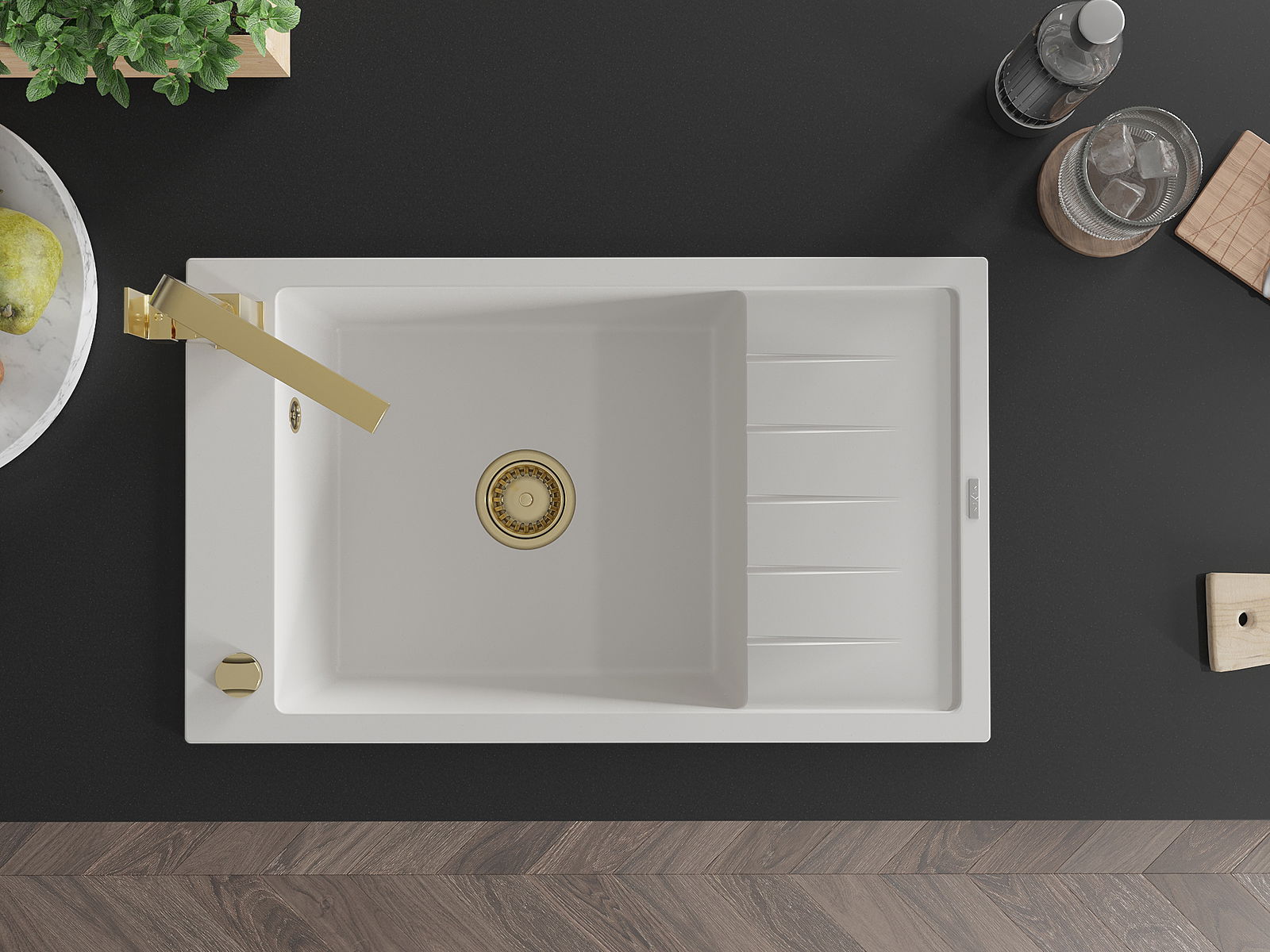 L'évier a un trou sous-meulé de 35 mm de diamètre à percer soi-même. Il peut être utilisé, entre autres, pour installer un distributeur de liquide, ce qui éliminera la présence de bouteilles en plastique dans la cuisine et lui donnera une finition élégante.