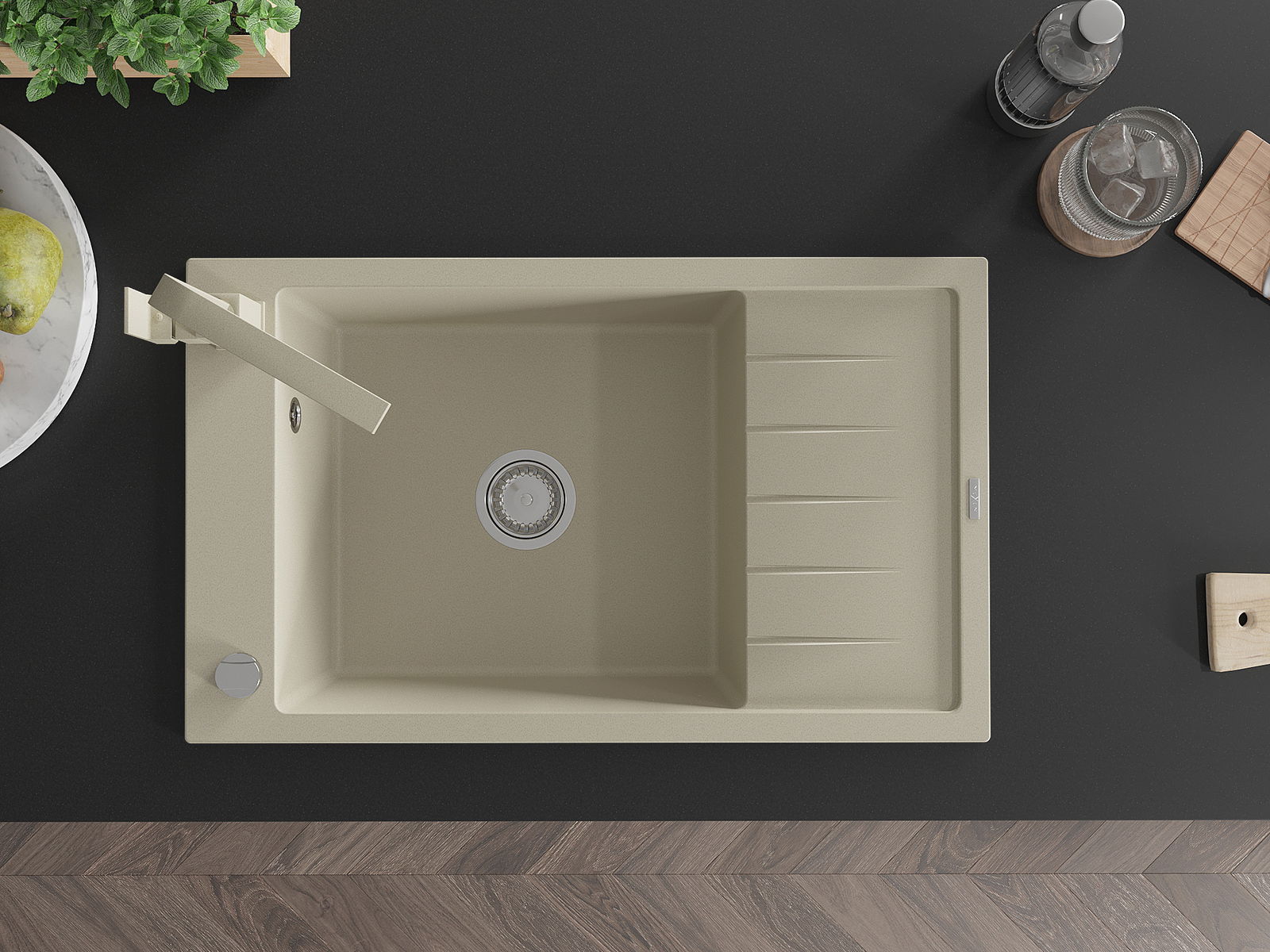 Mexen Elias évier en granit 1 bac avec égouttoir et robinet de cuisine Rita, beige - 6511-69-670300-69