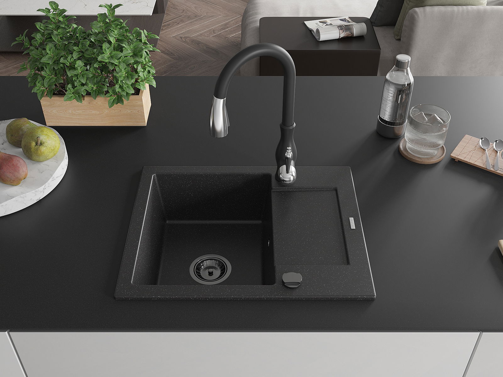 Mexen Enzo évier en granit 1 bac avec égouttoir et mitigeur de cuisine Savita, noir/argent métallisé - 6506-73-672601-70-B
