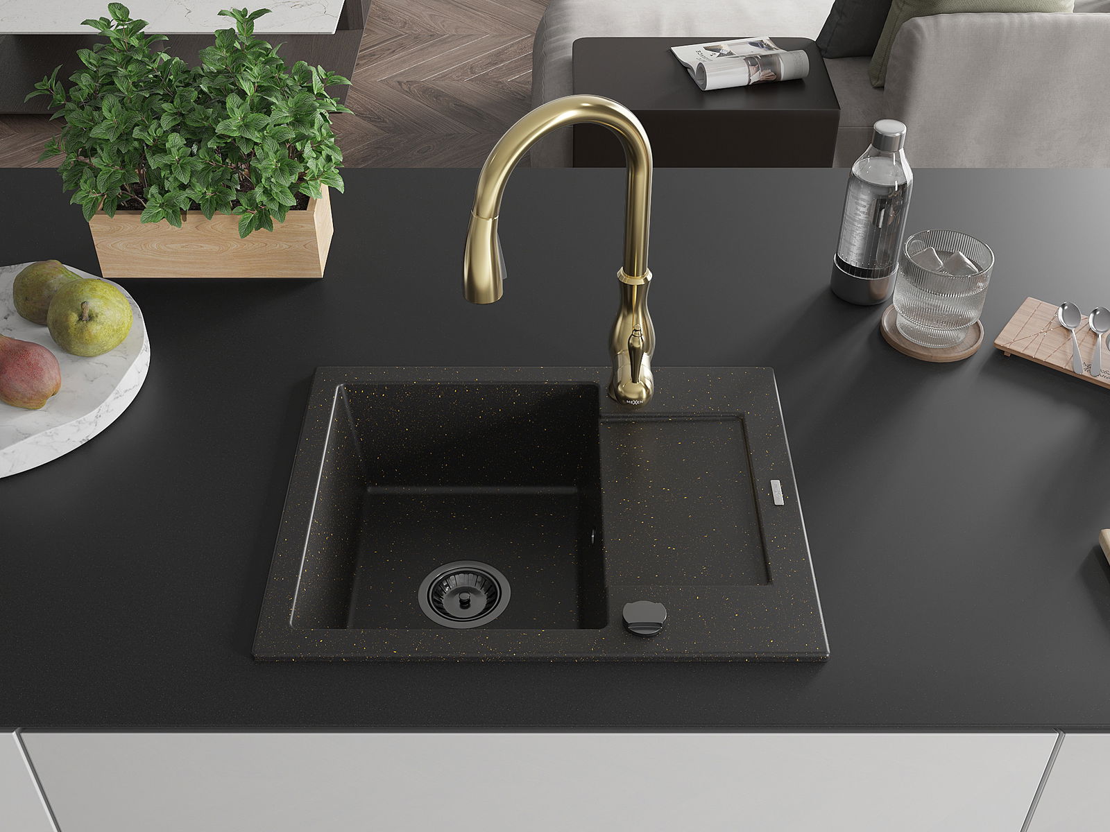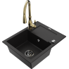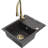 Mexen Enzo évier en granit 1 bac avec égouttoir et robinet de cuisine Savita, noir/doré métallique - 6506-75-672601-50-B